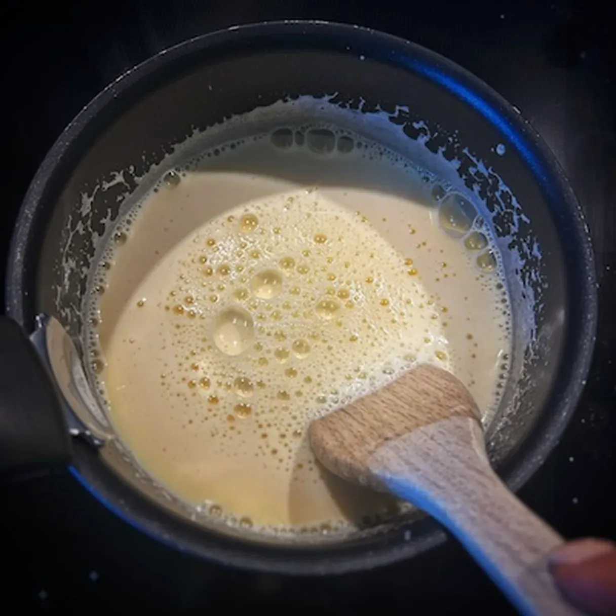 - You'll know it's ready when bubbles form in the center. Remove from heat and stir in a tablespoon of butter.