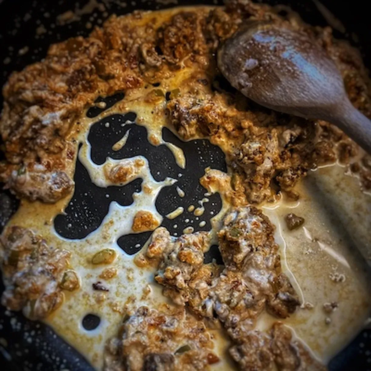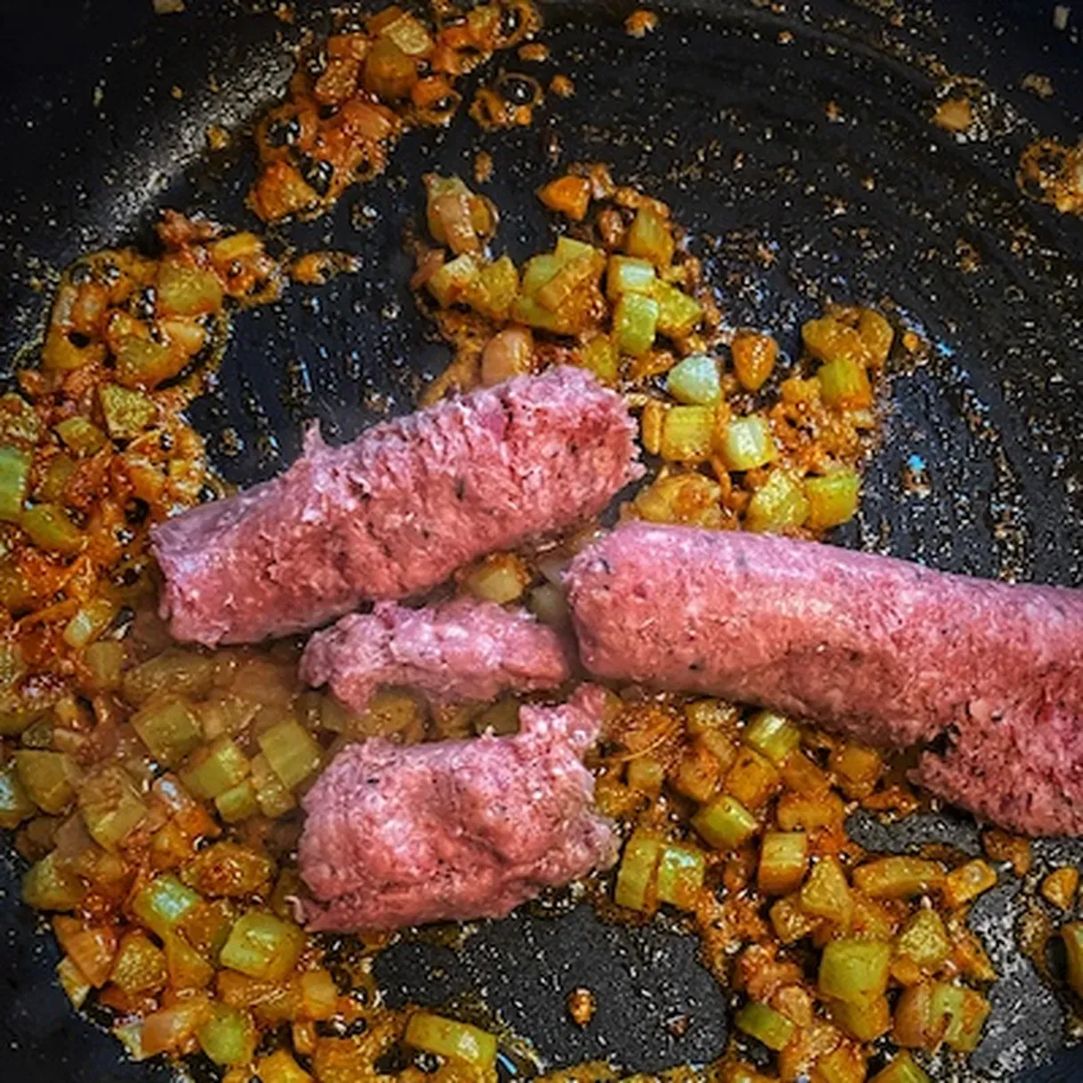 - Using a spatula, start breaking the composition into smaller pieces. Stir to combine. Take the heat to medium and leave it for a couple of minutes to allow the sausage to cook.