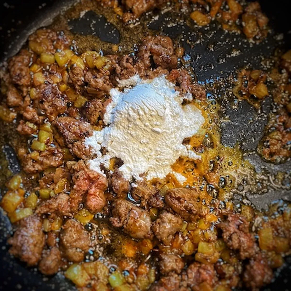 - Take the heat back to low and add the flour.