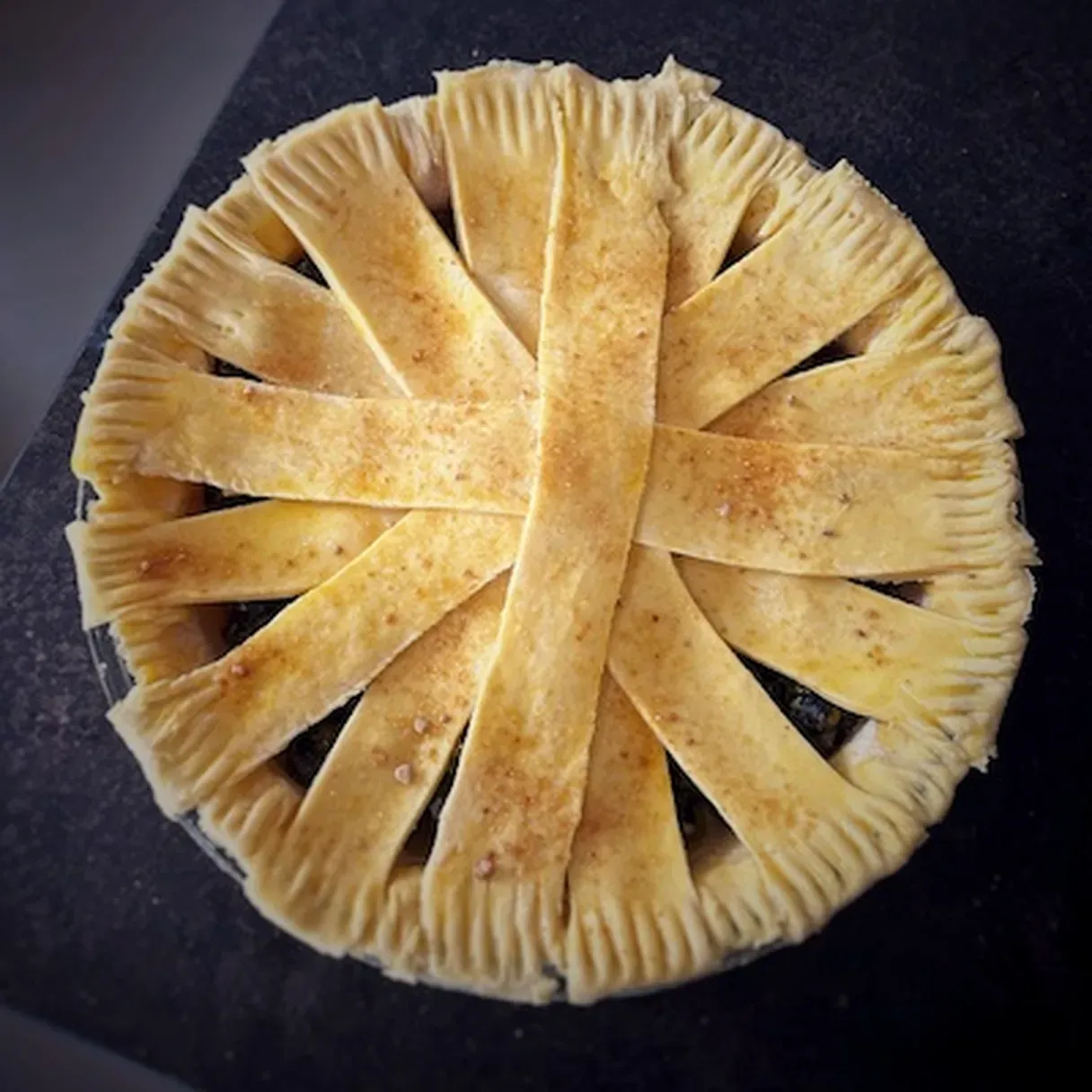 - Cut the dough into 2-3 cm thick strips and arrange them on top of the pie in a lattice or your desired pattern. Press them gently to the edges to secure them.