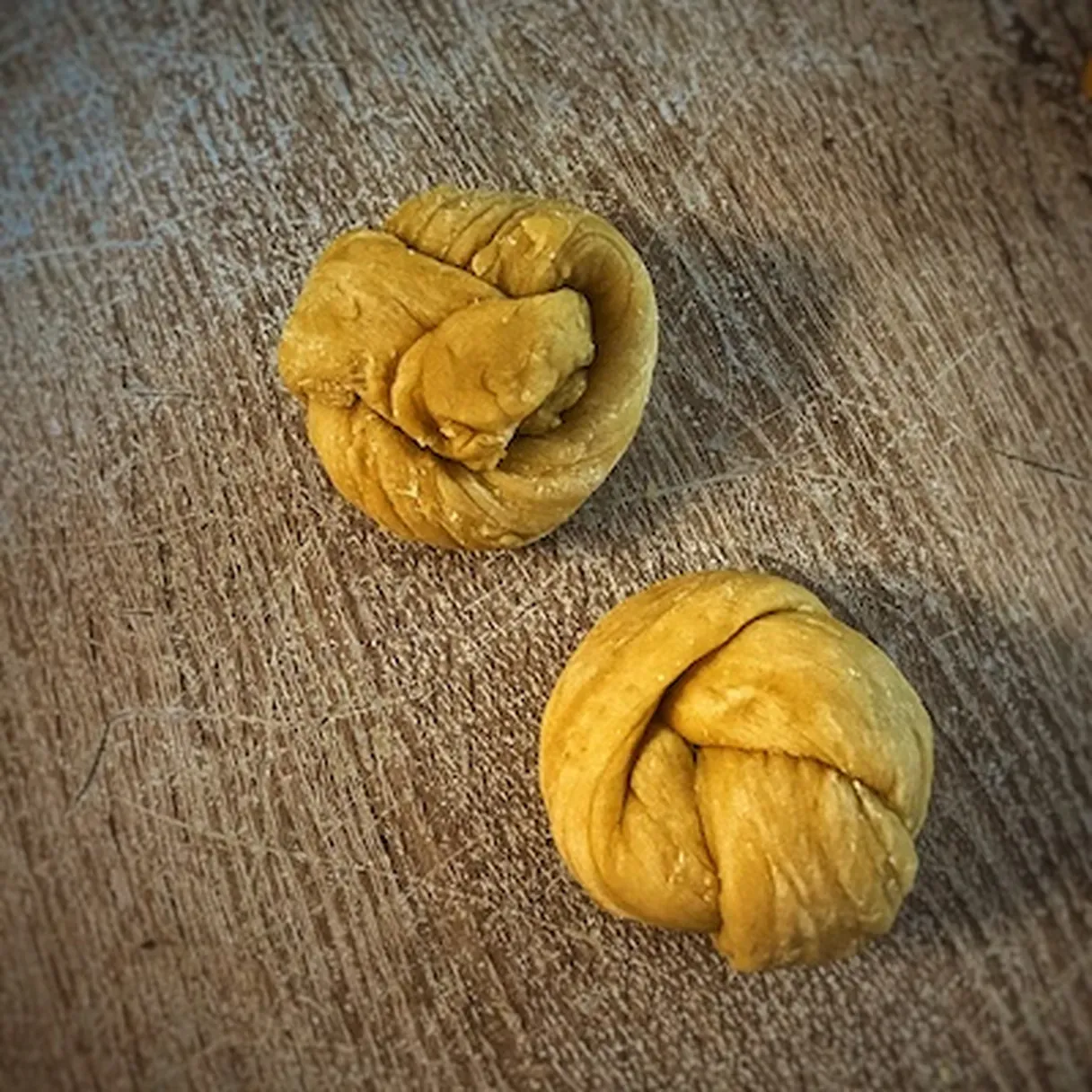 - Roll out each piece some more and make a knot. Grab the ends and tie them up at the back.