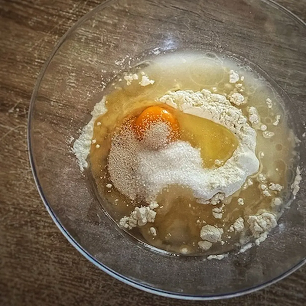 - In a bowl, mix the flour with the yeast, water, sugar, oil, salt, one whole egg, and one egg yolk. Don't throw away the remaining egg white because you will need it later.