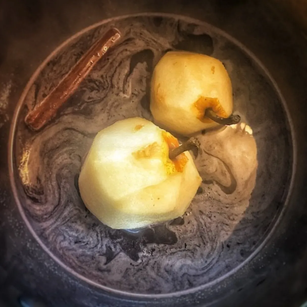 - Peel the pears, but leave them in one piece. Add them to the simmering syrup and poach them for 10 minutes or so.