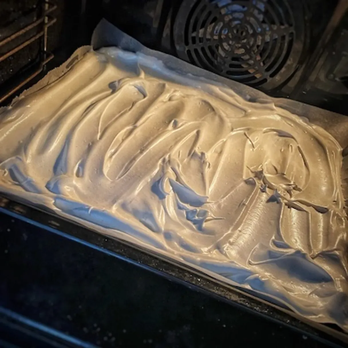 - Grease and line an oven tray with parchment paper. Spread the meringue on it and bake in the preheated oven at 160 degrees Celsius for 20-25 minutes or until slightly brown.
