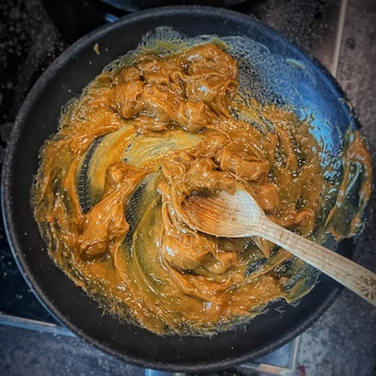 - Open your dulce de leche can and pour it into a clean skillet. Add the vanilla extract and salt and place the skillet on medium-low heat. Stir until the dulce de leche gains a more liquid consistency but be careful not to burn it.