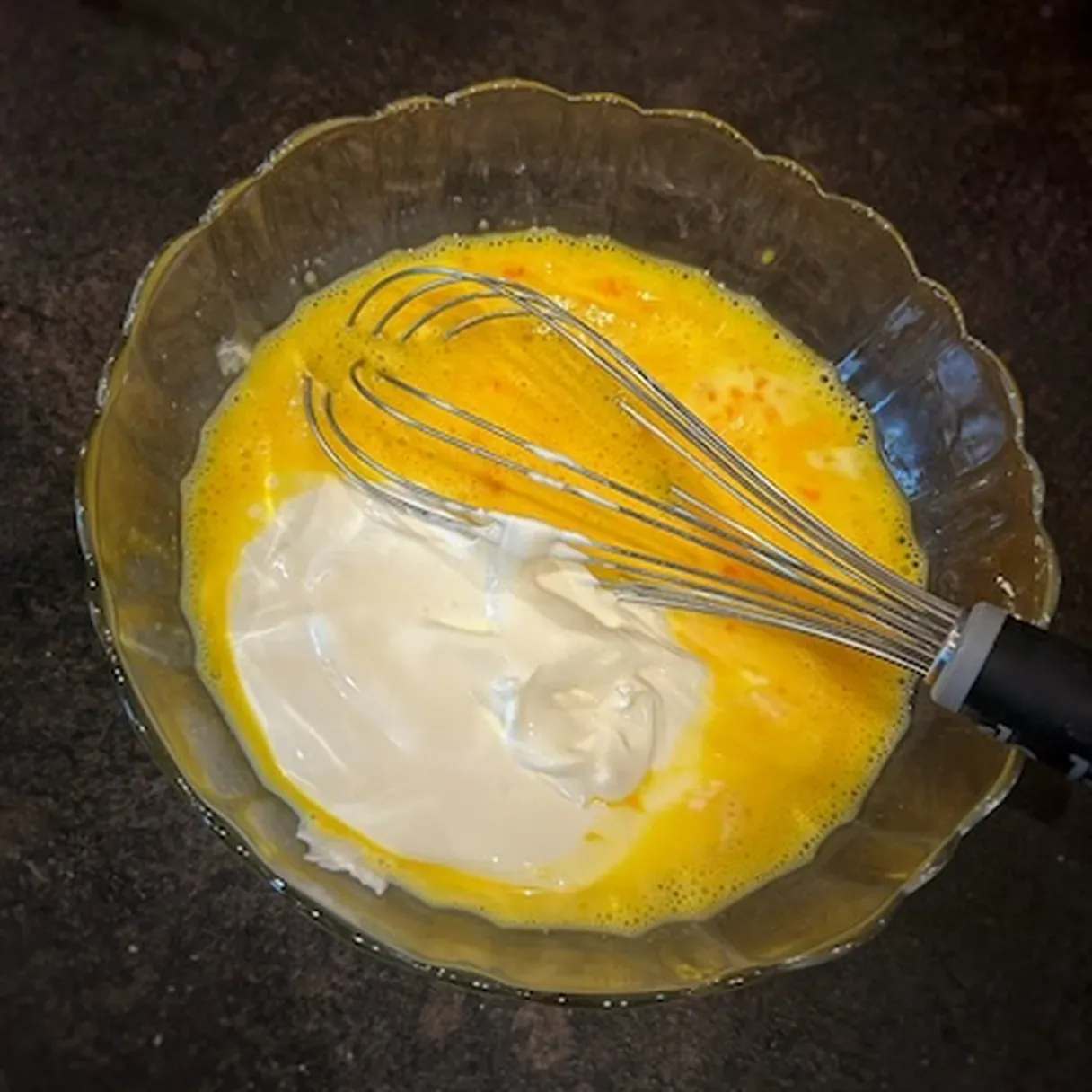 - Whisk together three eggs, milk, and sour cream.
