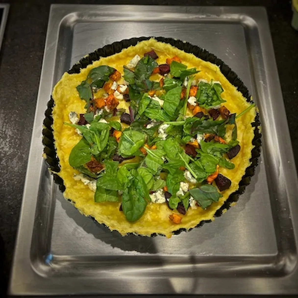 Autumn quiche with butternut squash, beet, Roquefort, and walnuts. Rich, seasonal flavors in a buttery crust.