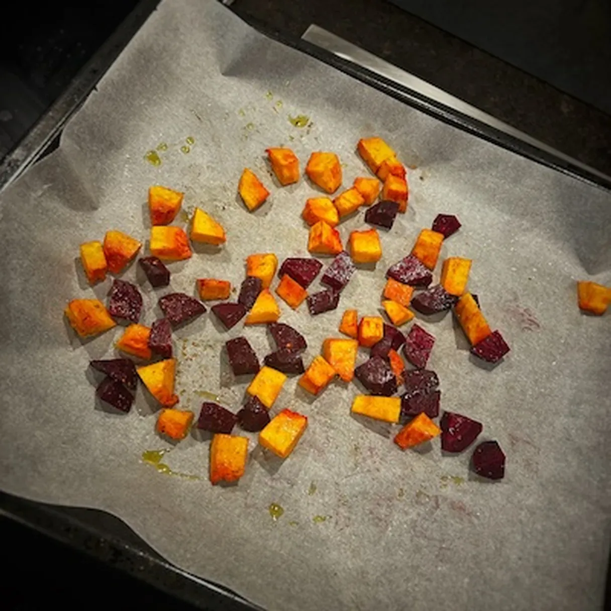 - Roast cubed butternut squash and beet with olive oil, salt, pepper, paprika, and granulated garlic at 180°C for 40 minutes.