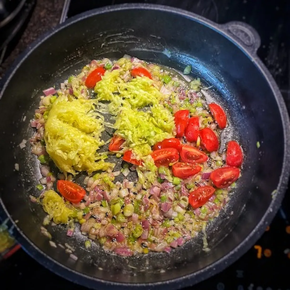 - When no more liquid comes out of your cloth, you can transfer the grated zucchini into the skillet along with the chopped tomatoes.