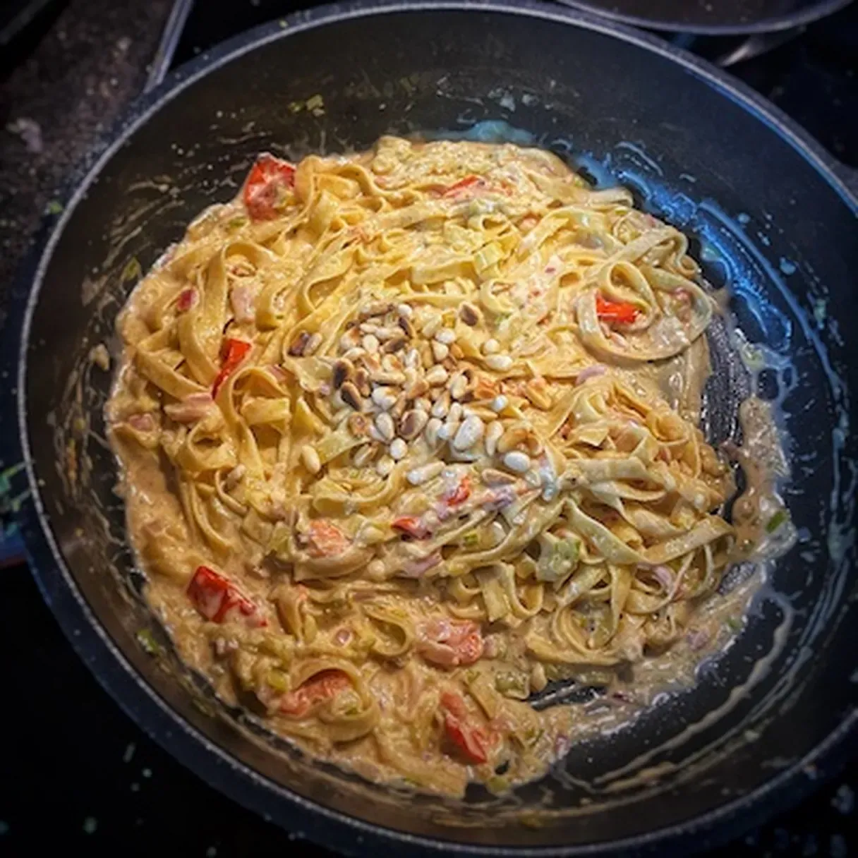 - When the garlic lemon pasta sauce is all bubbly and nice, add the pesto and roasted pine nuts.