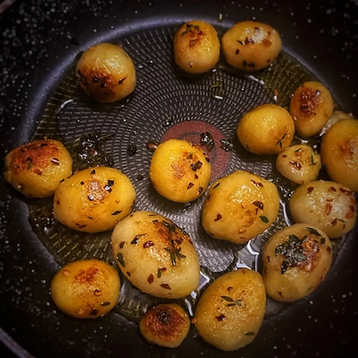 - In another pan, heat the olive oil. Add the pre-boiled potatoes and let them char a little. After a couple of minutes, add the chili flakes, the thyme, and the salt, then remove from heat.