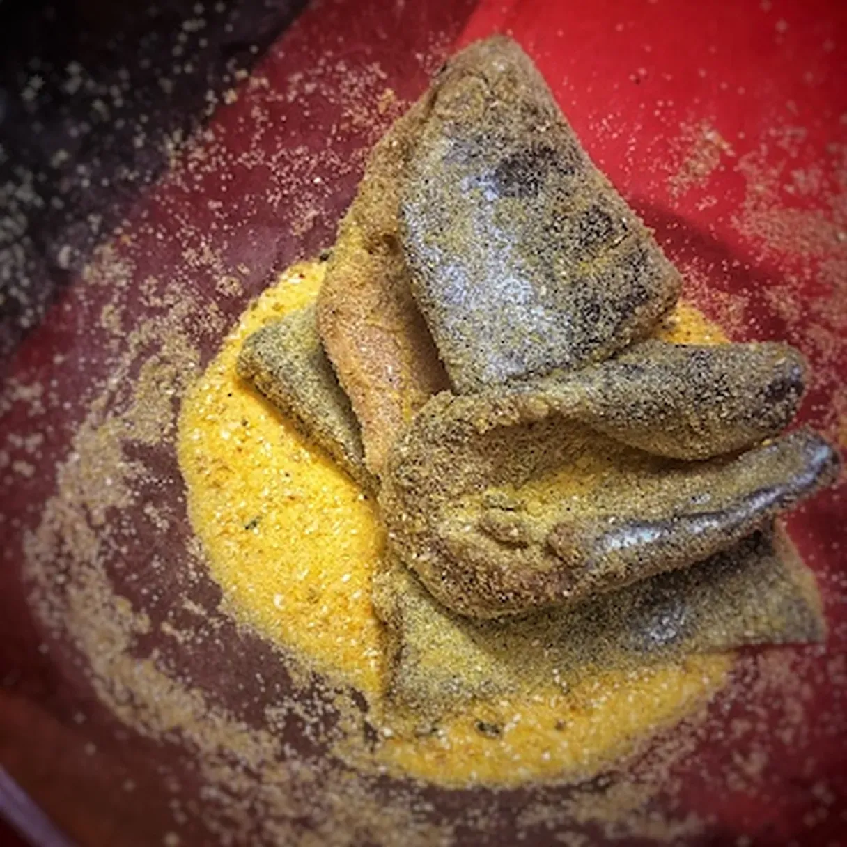- Cut the fish into 10-12 cm medallions and rub them with the powder. If you need more powder, repeat the process.
