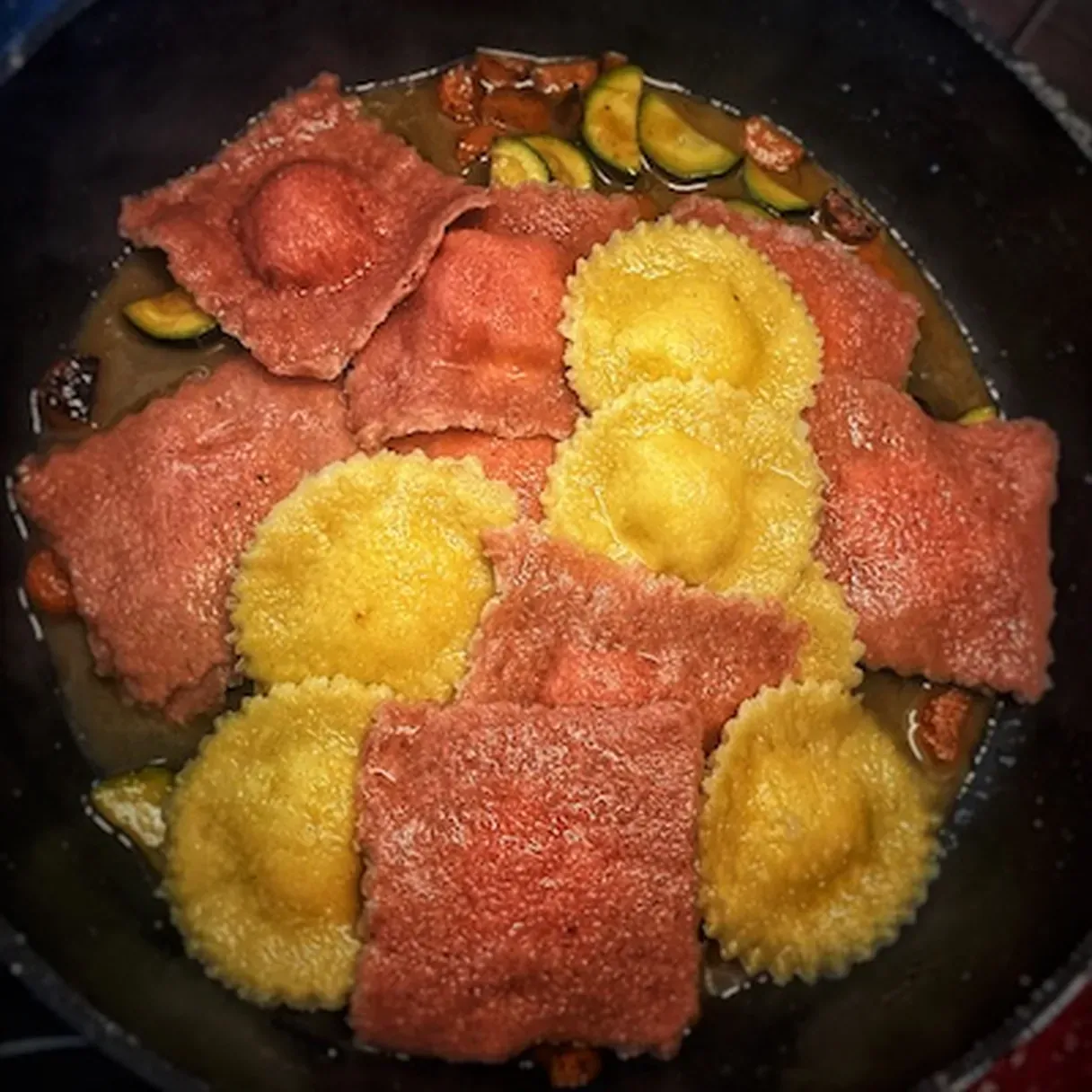 - Put the pan with the veggie sauce back on medium heat; after 2 minutes of boiling, transfer the ravioli, plus some of the starchy water in the pan and let it cook for a couple of minutes.