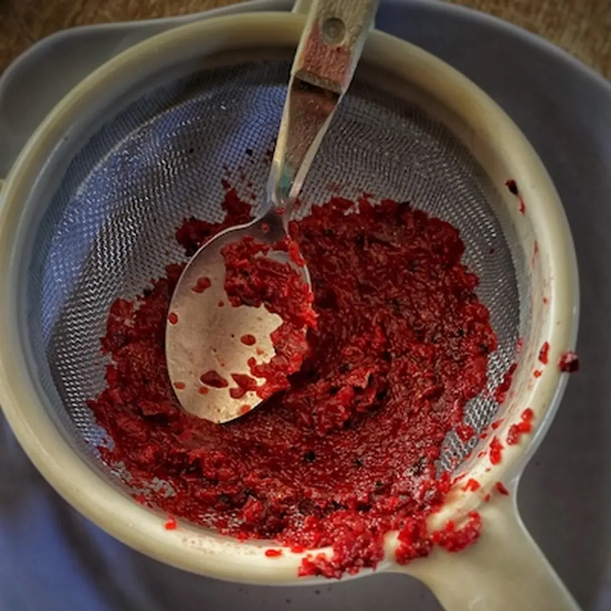 - Using a strainer, strain all your grated beetroots in your second bowl. You want everything to be as fine as possible.