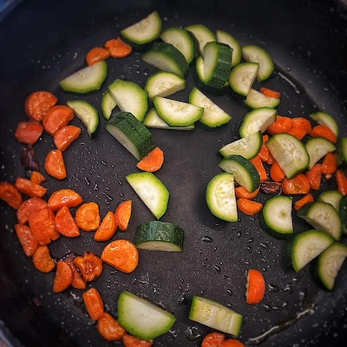 - In the same pan, heat up the remaining olive oil. Cook the chopped carrots for 5 minutes on medium heat. After that, add the zucchinis and leave them to cook for another 2 minutes.