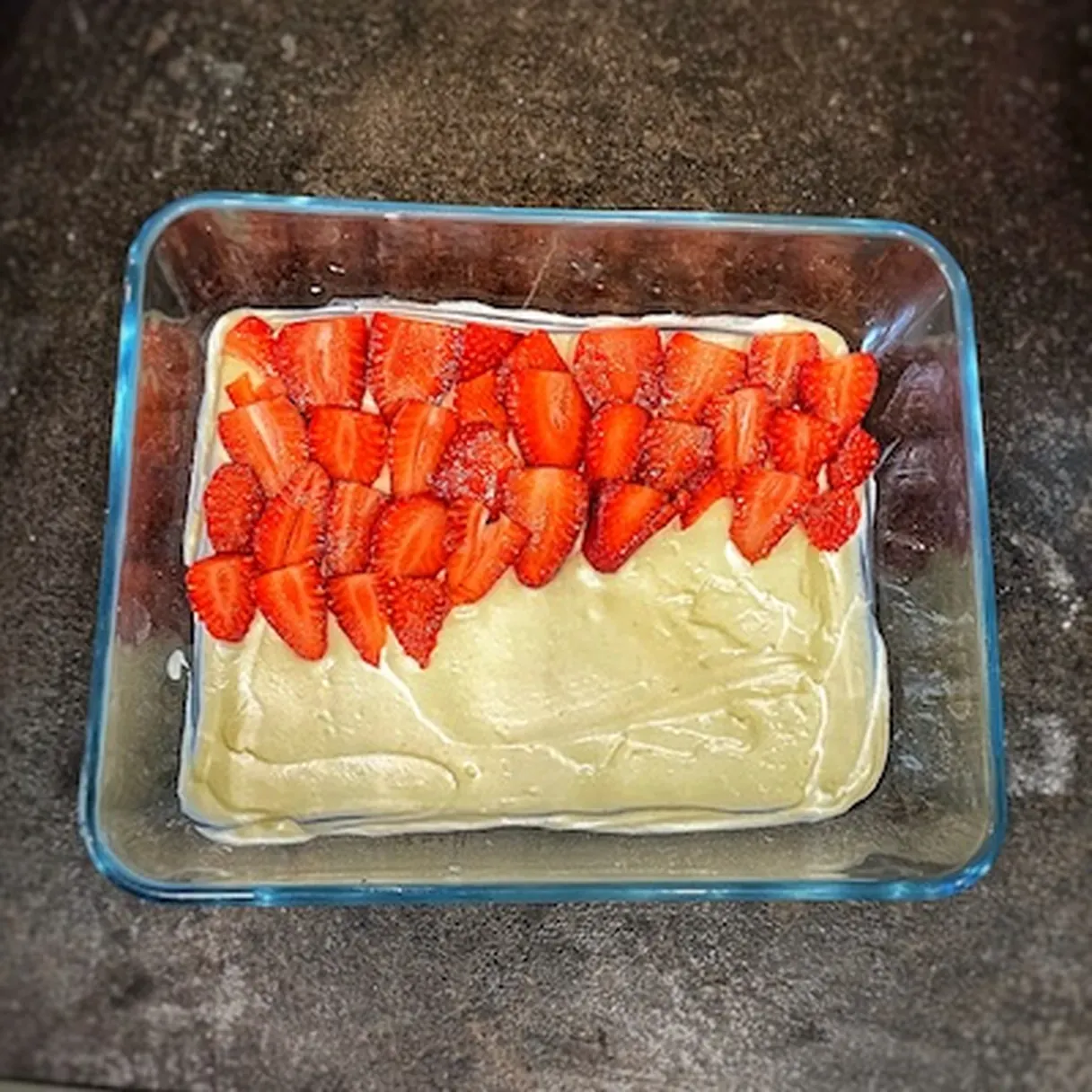 - Slice your strawberries and arrange them on the cream. Do it in any way you want.