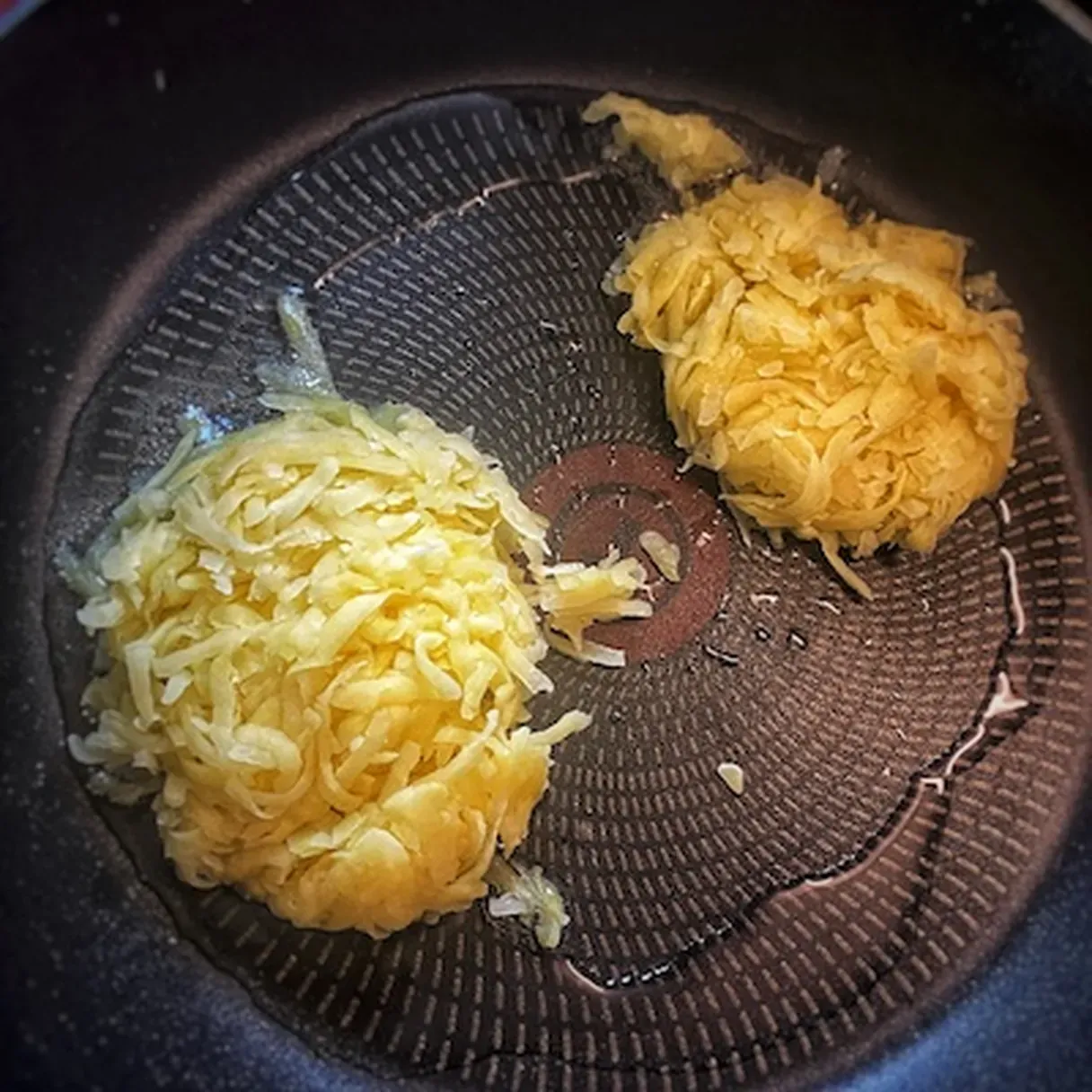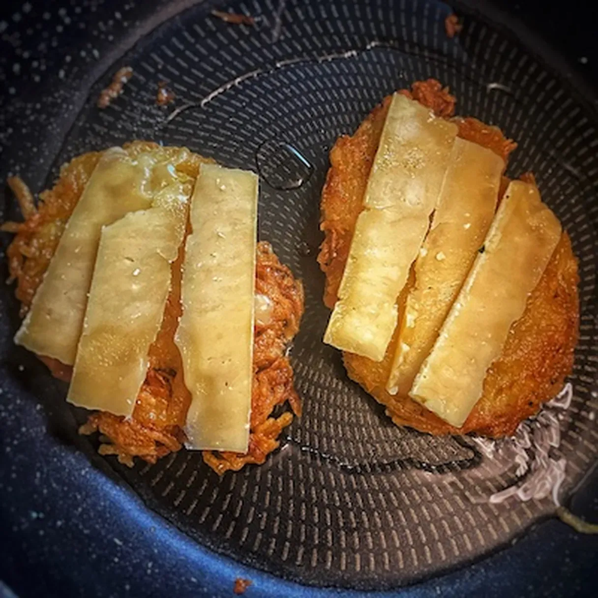 - Flip it on the other side, place the cheddar slices on the hash browns and let them get completely crispy for another 4-5 minutes.