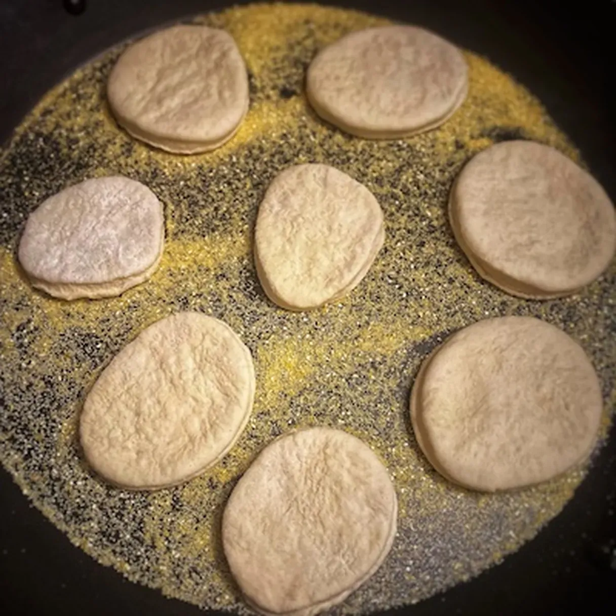 - Heat up a cast-iron skillet, but let the stove on medium-low heat. Place the pieces of dough in the skillet and let them cook for 5 minutes on each side.