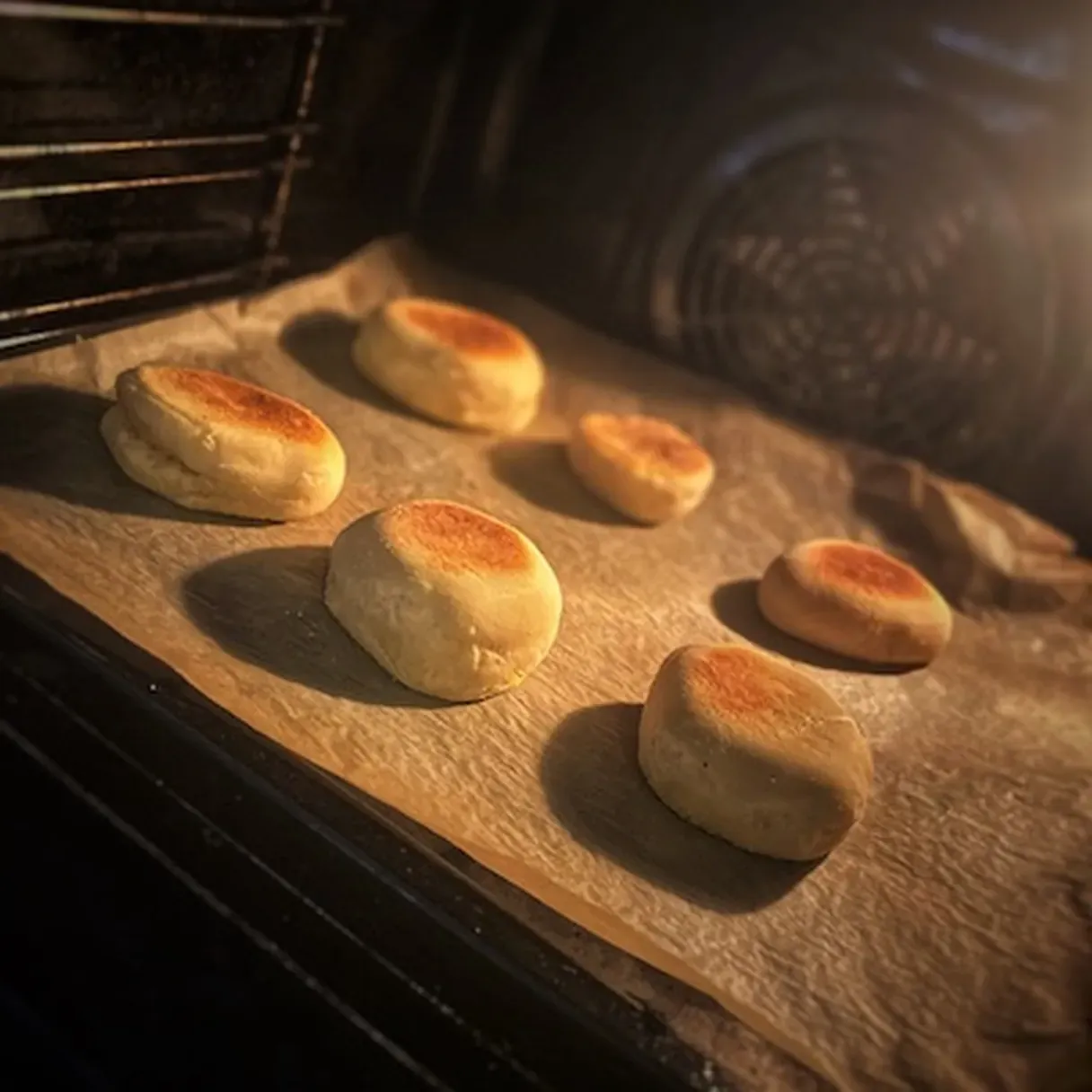 - Don't worry. This is still a baked English muffin recipe. Once they are done on the stove, transfer them on a tray lined up with parchment paper and baked them for 5 minutes in the preheated oven at 180 degrees Celsius (350 F).