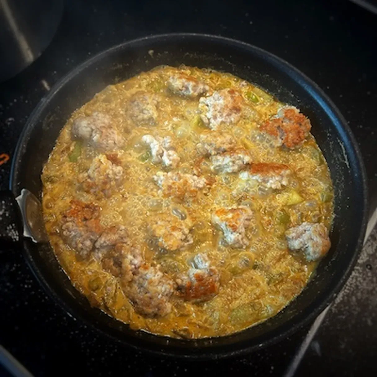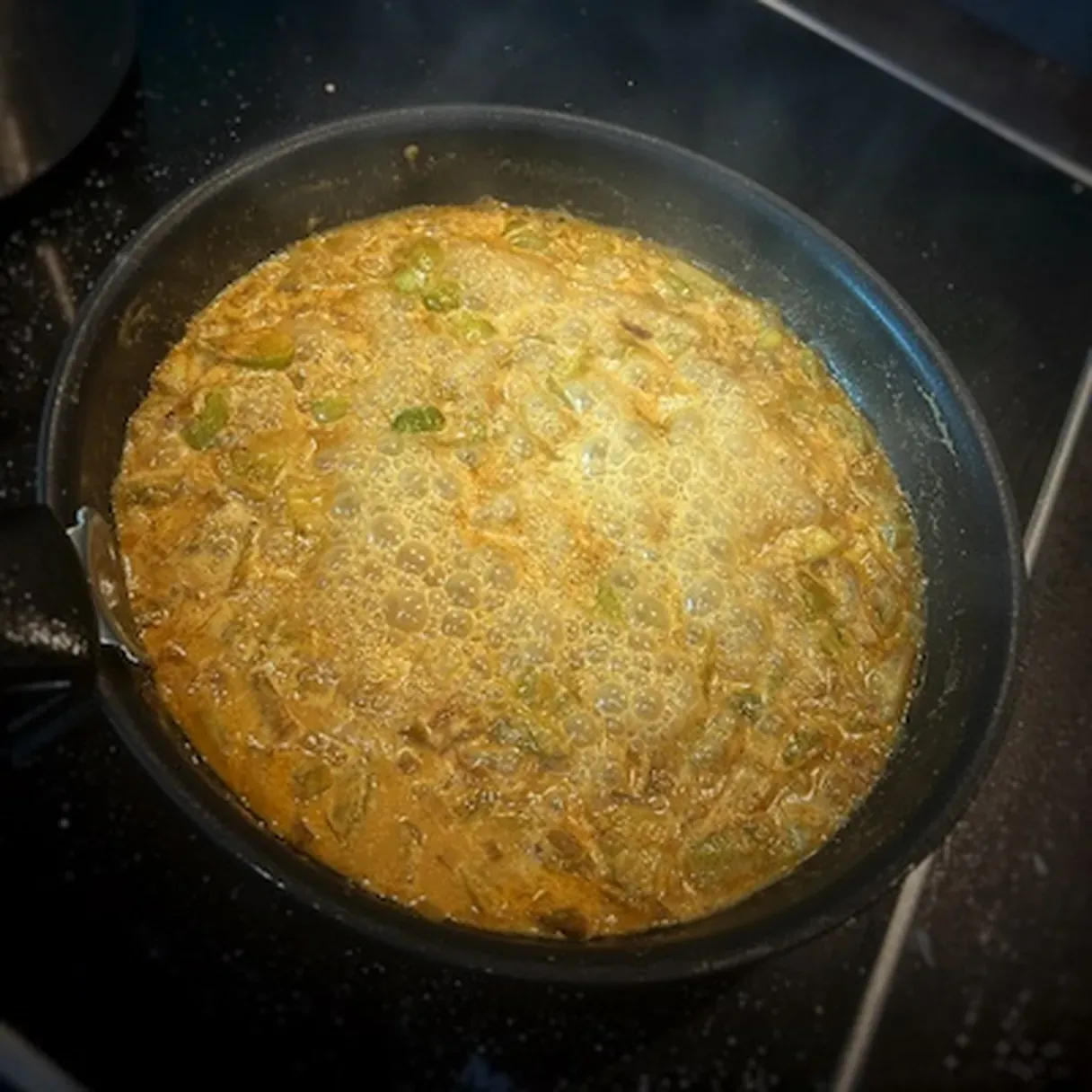 - Add the liquid cream, water, and the spices (cumin, paprika, coriander, salt, and pepper). Let this cook for 7-9 minutes.