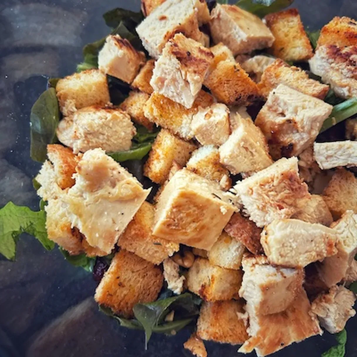 - In a large bowl, combine the salad greens of your choice, chopped green onion, brie cheese, walnuts, dried cranberries, croutons, and the grilled chicken breast that has been chopped into cubes.