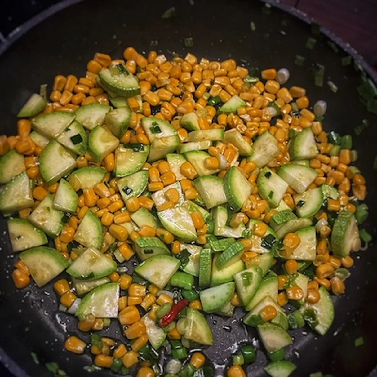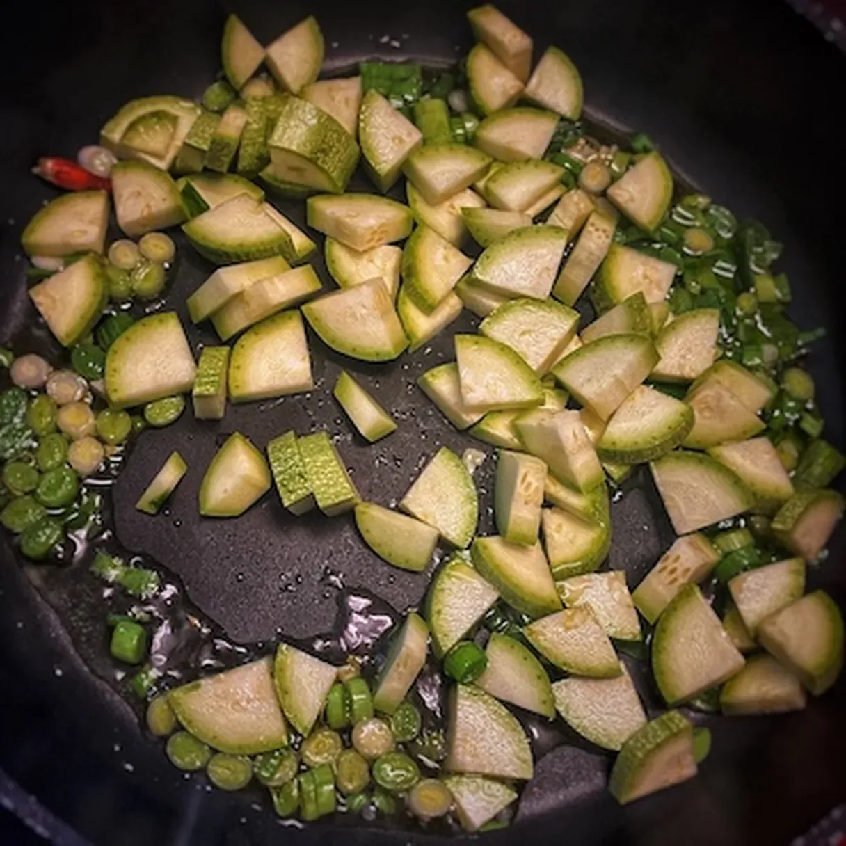 - Chop the green onion and cook it in the pan on medium heat for a couple of minutes along with your hot, dry chili.