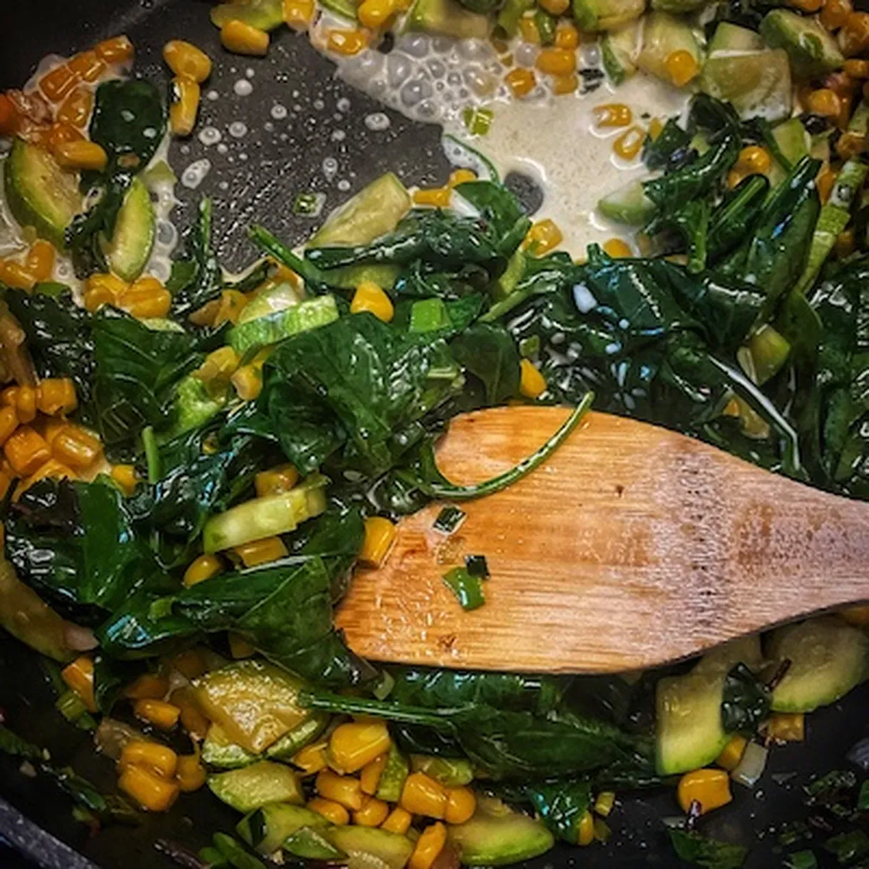 - Cook the spinach for a minute, then pour the double cream in. Stir to combine, bring the stove to medium-low, and simmer for 30 seconds to a minute—season with salt and pepper to taste and let it rest.