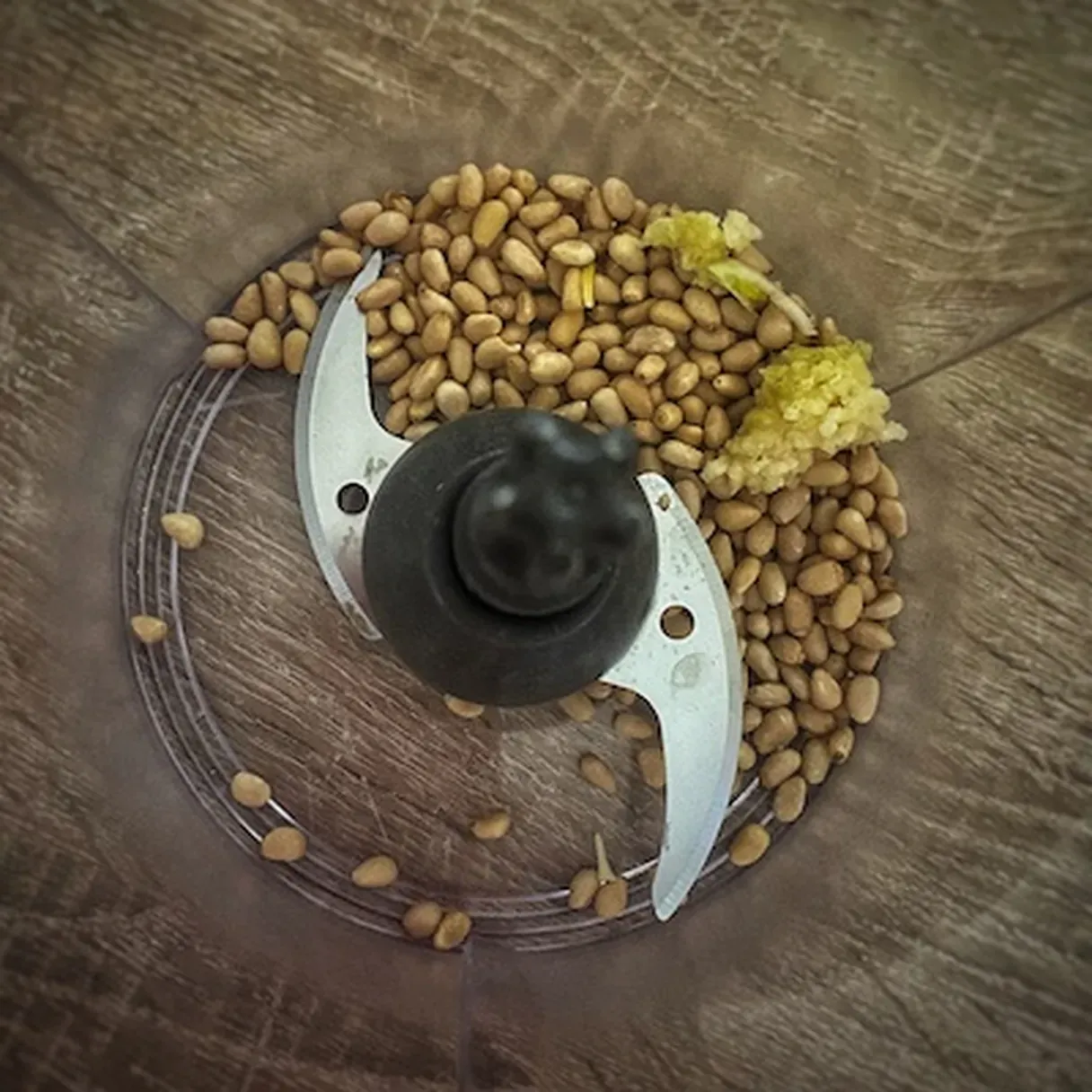 - The main equipment you need for this sauce is a food processor. Add the pine nuts to your food processor, grate the garlic over it and pulse until you crush all nuts.