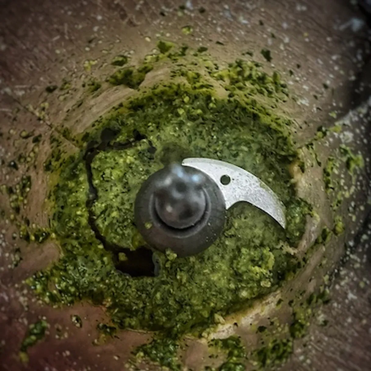 - Start pouring the olive oil and continue to pulse, so the oil is perfectly incorporated. You might need more or less than a cup of oil. You want to stop when the composition has a paste texture, but it's not too oily.