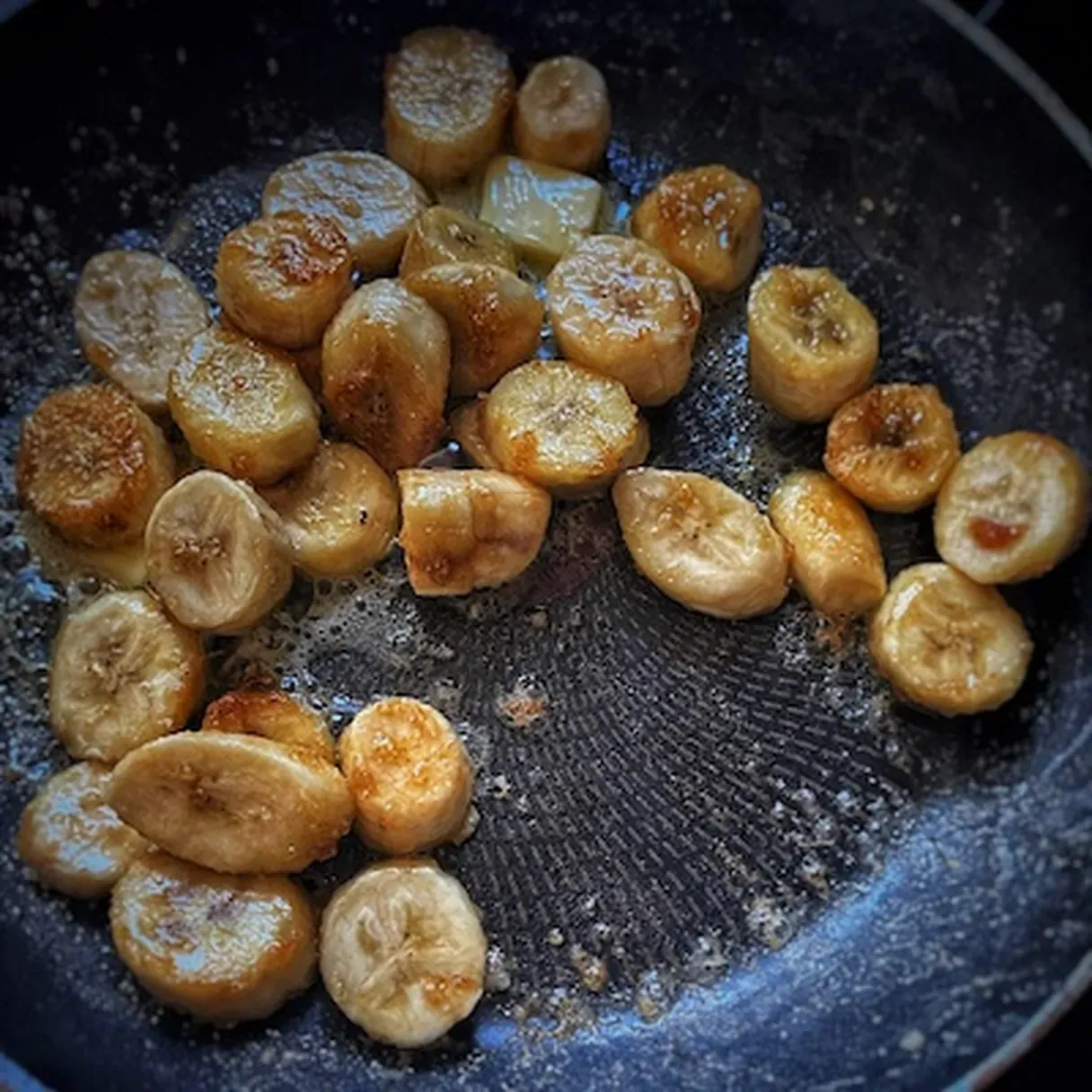 - Cut the bananas into 1 cm slices. Heat up the butter in a pan and fry them on medium heat for 3-4 minutes on each side or until golden. If you want them more caramelized, you can sprinkle some brown sugar in the pan with the butter. I honestly don't think it is necessary, yet you might think differently.