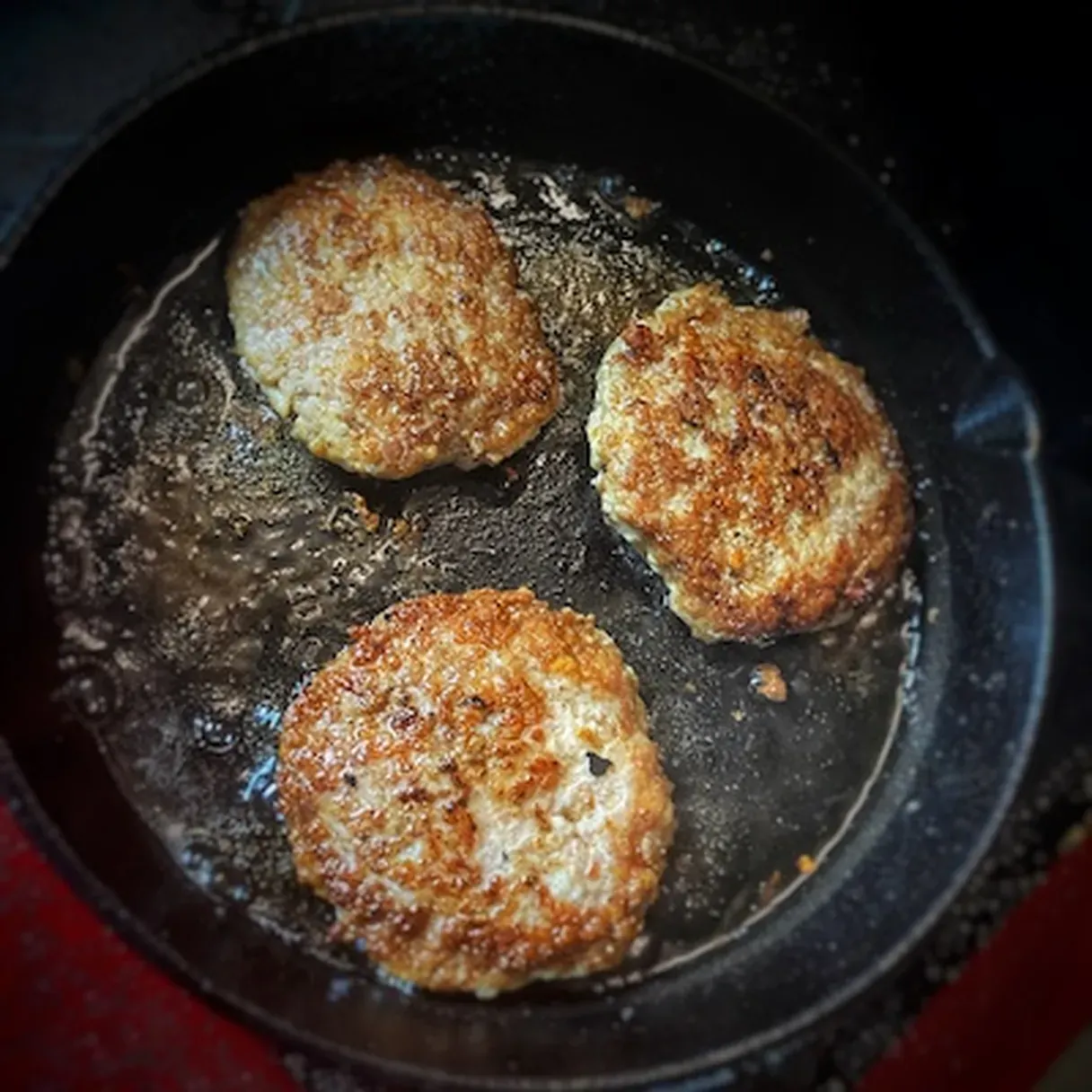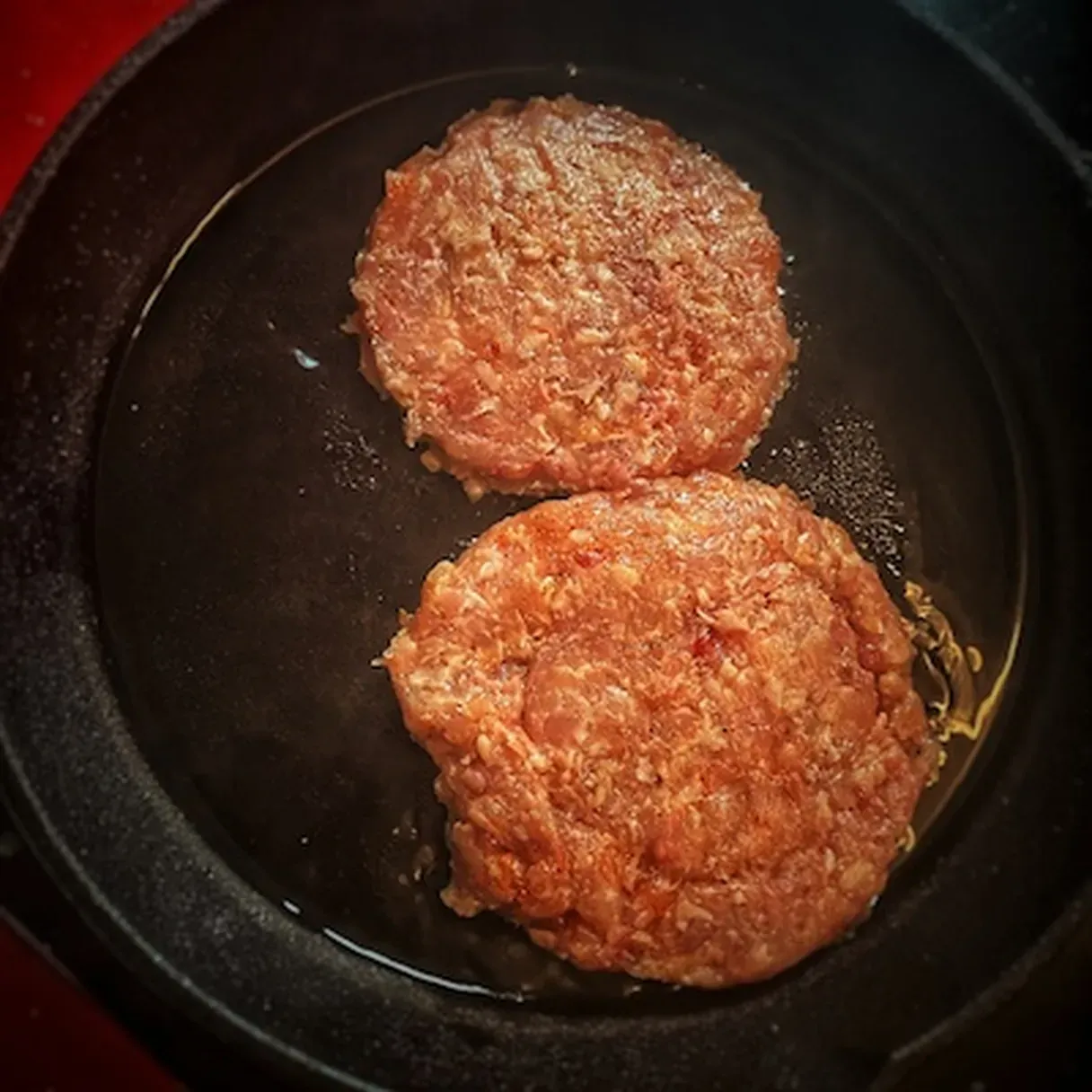 - Heat up a cast-iron skillet. Add the frying oil and fry each burger patty at medium heat.