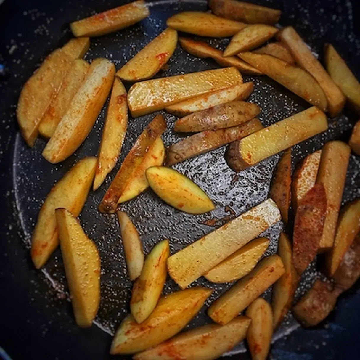 - When you are ready to eat, cut the potatoes into wedges and place them on an oven-proof tray. Season them and make sure that each piece is perfectly coated.