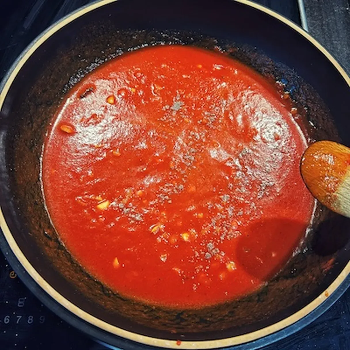 - Stir in the tomato paste and tomato juice, and add sugar and the rest of the spices. Bring to a simmer.