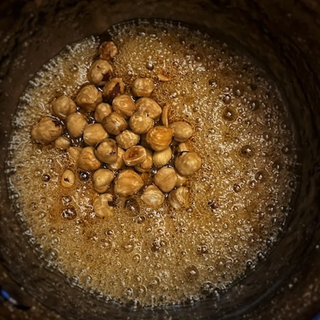 - Pour the water and the sugar into a saucepan. Leave it on low heat until the caramel starts to form. This should be around 15-20 minutes. When the caramel is ready, add the hazelnuts and stir.