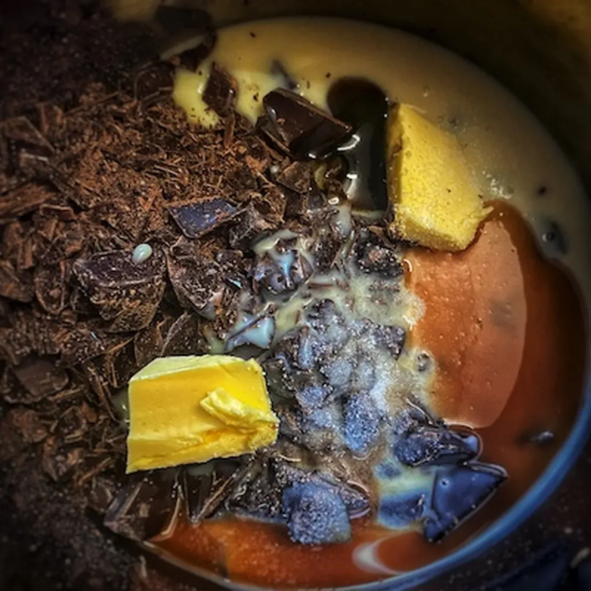 - Chop the dark chocolate and add it to a different pan. Pour the sweetened condensed milk, vanilla paste, butter, and liqueur. Put the pan on low heat and stir until the chocolate is completely melted.