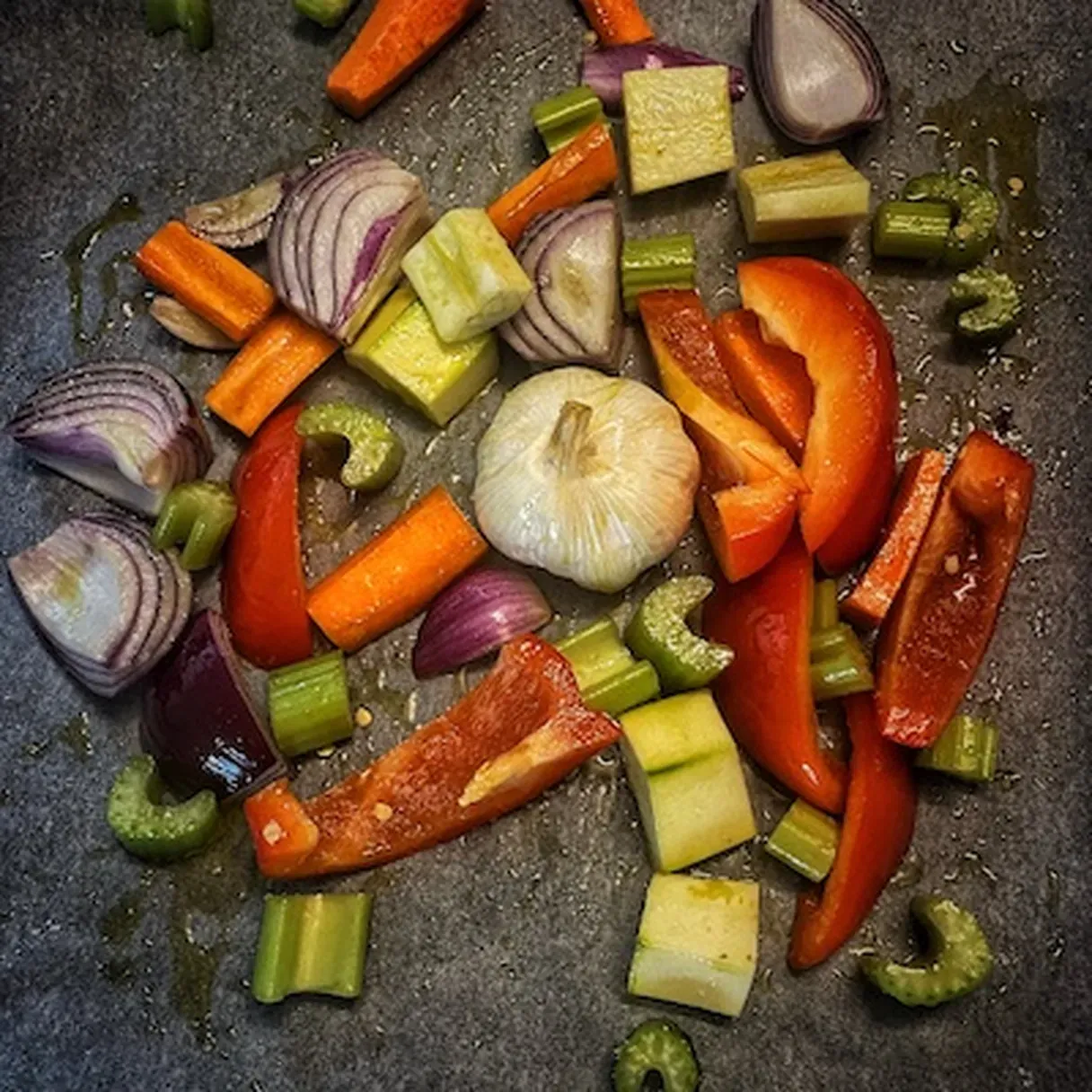 - The first thing you want to start with is making the sauce. Thus, peel one onion and the carrot. Chop them, along with the celery stick and zucchini, and place them, plus the garlic on an oven tray lined with baking paper. Drizzle the olive oil, salt, and pepper over them and coat everything.
