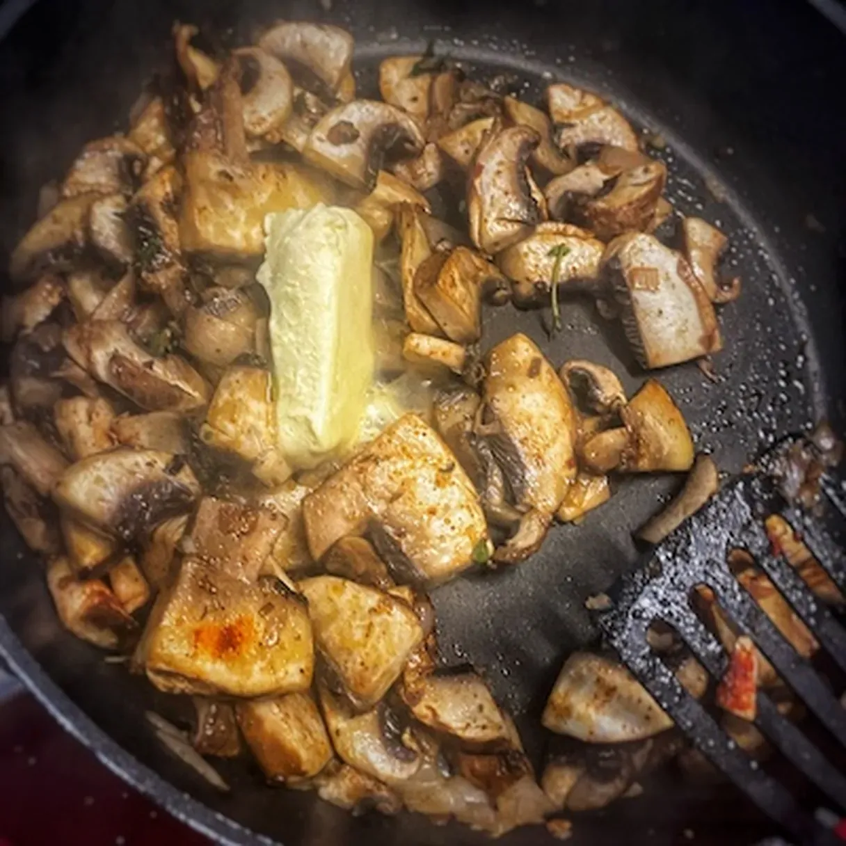 I served everything on a bed of mashed potatoes, and that is why I decided to call the dish a Mushroom Madness.