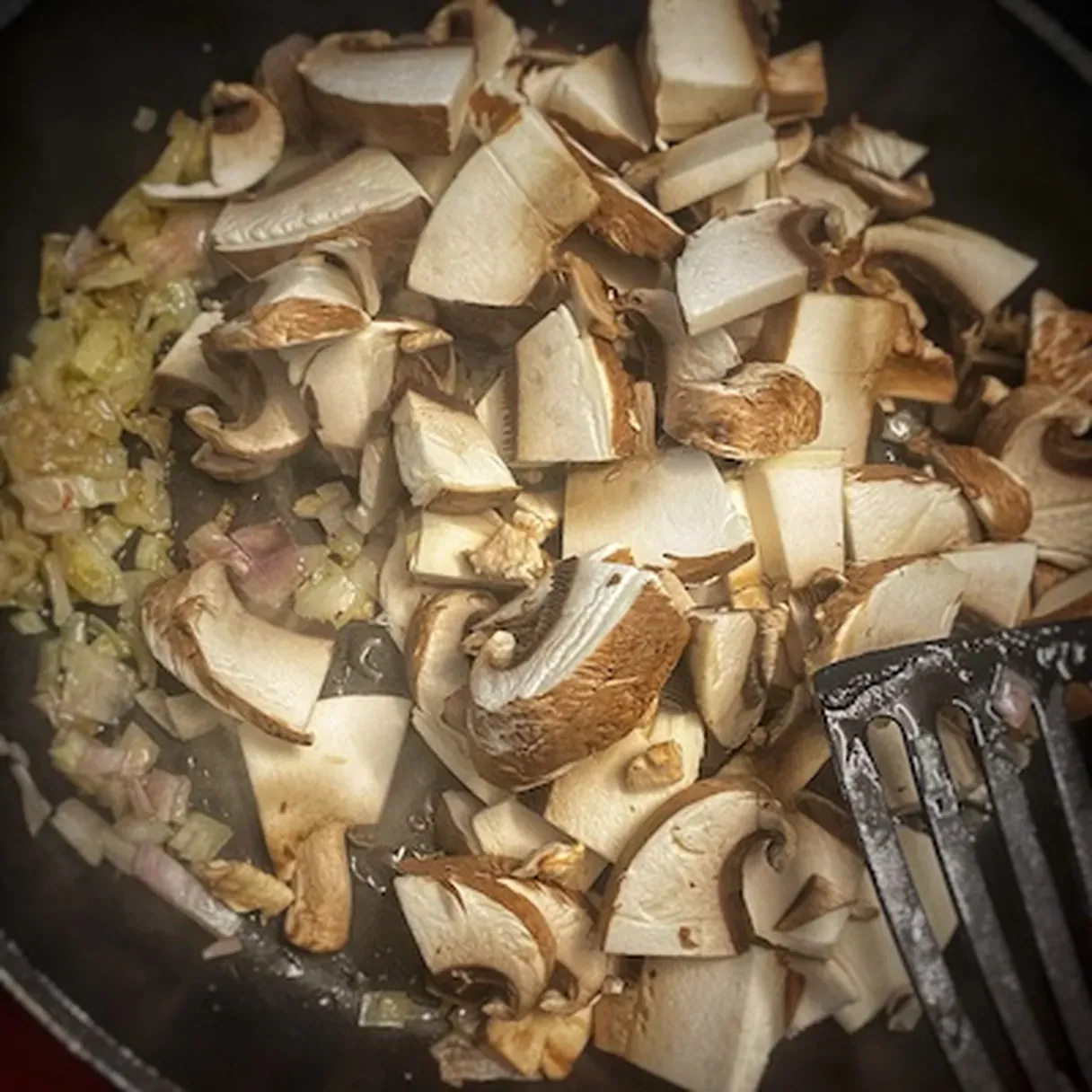 - Chop the portobello mushrooms into 2-3 cm pieces and add them to the pan. Let them reduce in size on medium heat. This should not take more than 3 minutes.