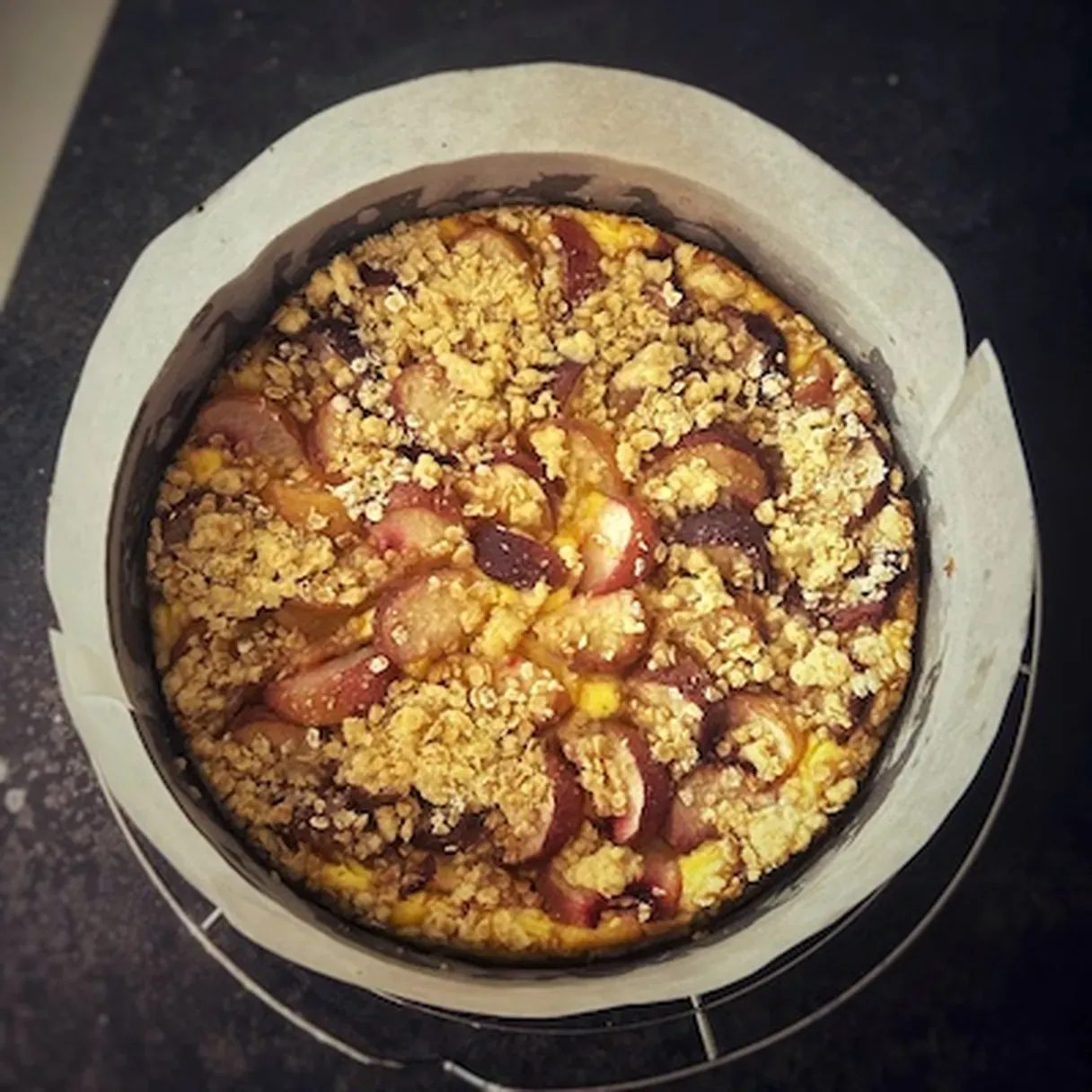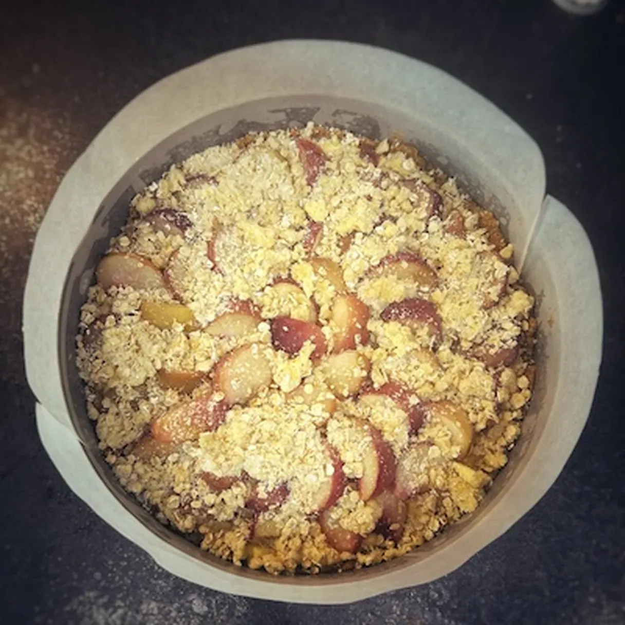 - Prepare the crumble by mixing 40g of flour, 25g of brown sugar, 25g of cold butter, and 20g of rolled oats.