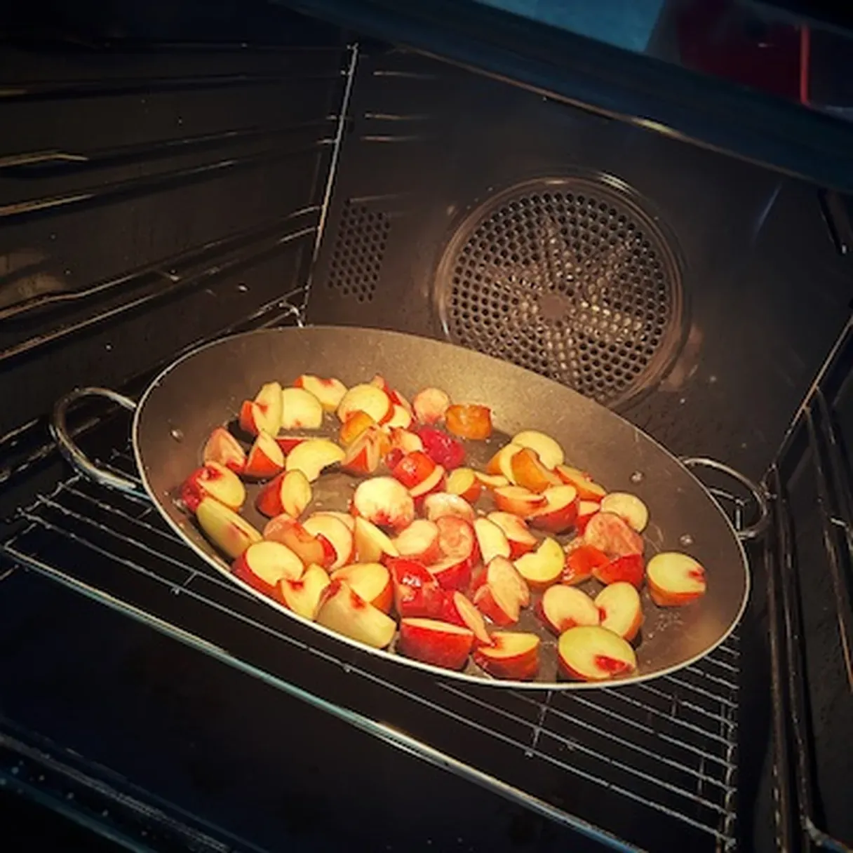 - Toss 500g of sliced peaches with rum and 100g of brown sugar. Place these in a baking dish and bake for 8-10 minutes.