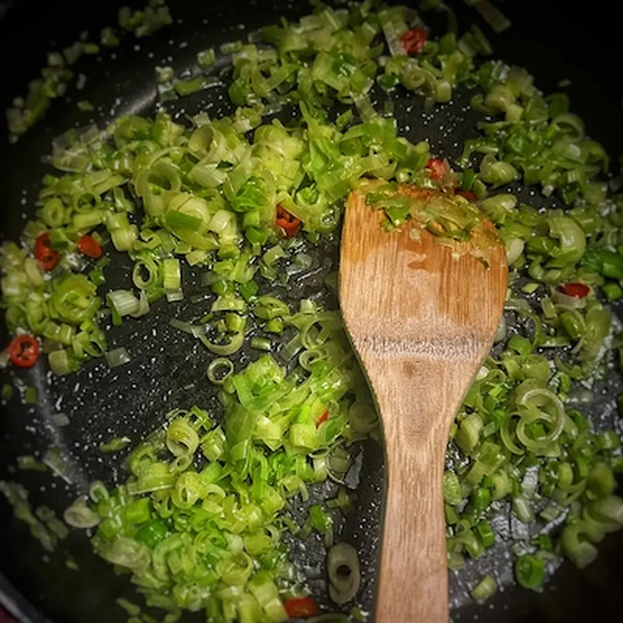 - Heat up a pan and drizzle some olive oil in it. Bring the leek into the pan and let it cook o medium-low heat for a couple of minutes.