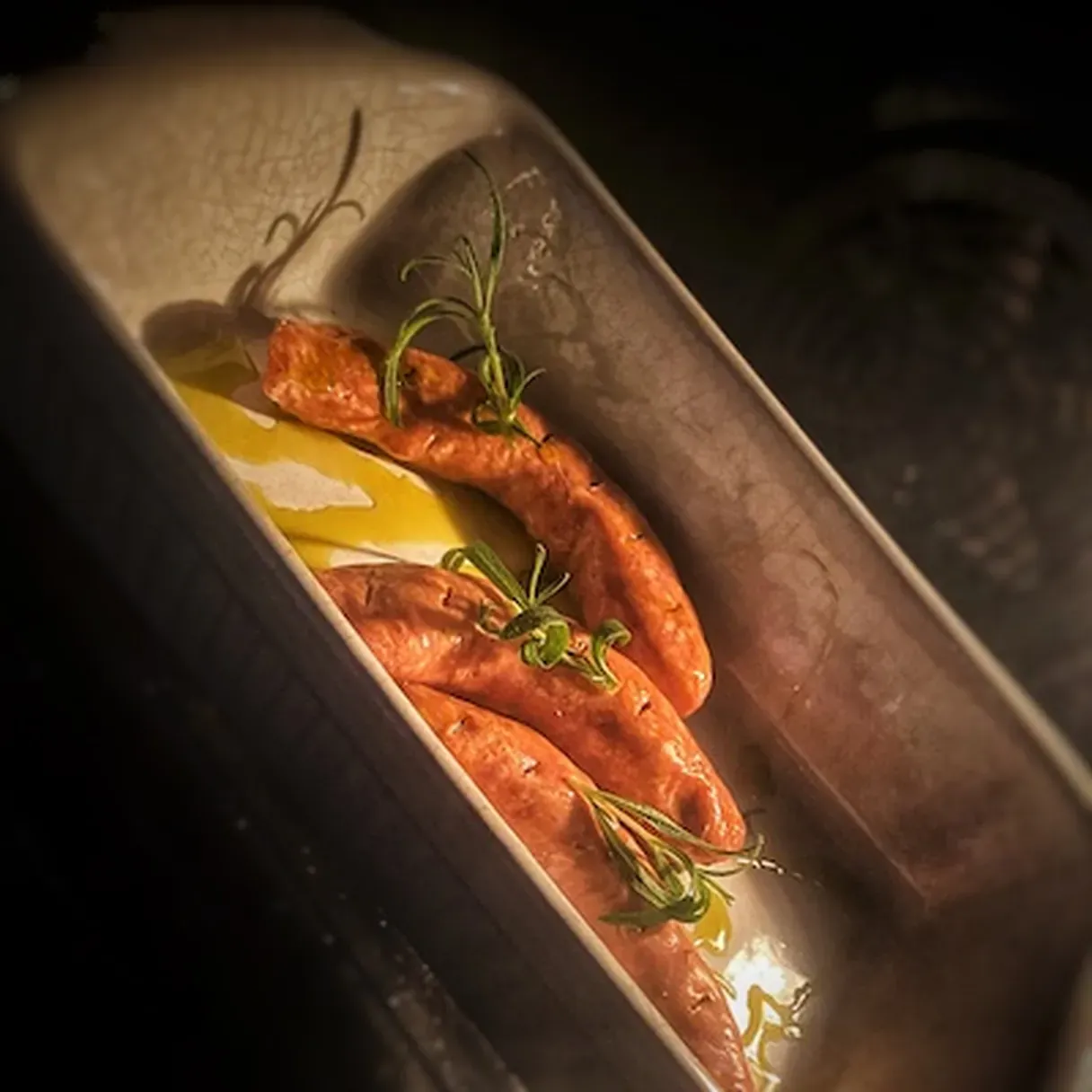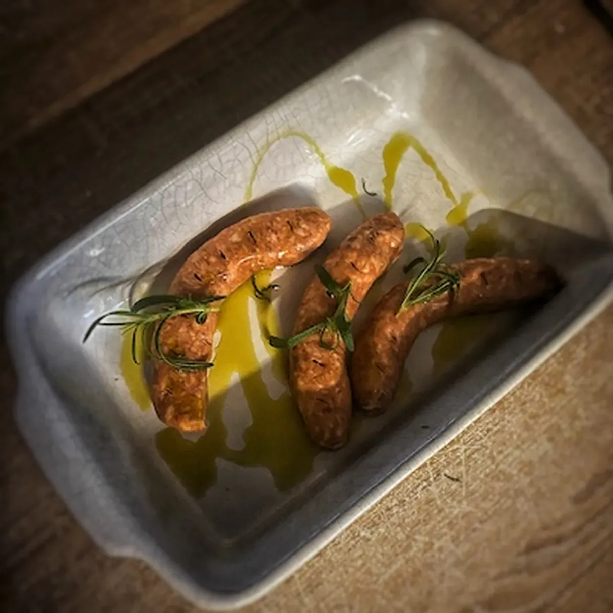- Place the sausages in an oven-proof dish. Drizzle some olive oil on them, and stick the rosemary stems in three of the incisions you've made.