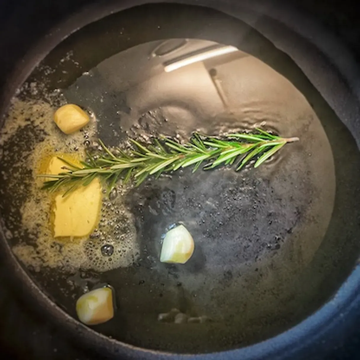 - Take a big cast iron pot. Heat up your olive oil and butter. Place the rosemary and the garlic cloves in there and let them cook for a couple of minutes on medium heat.