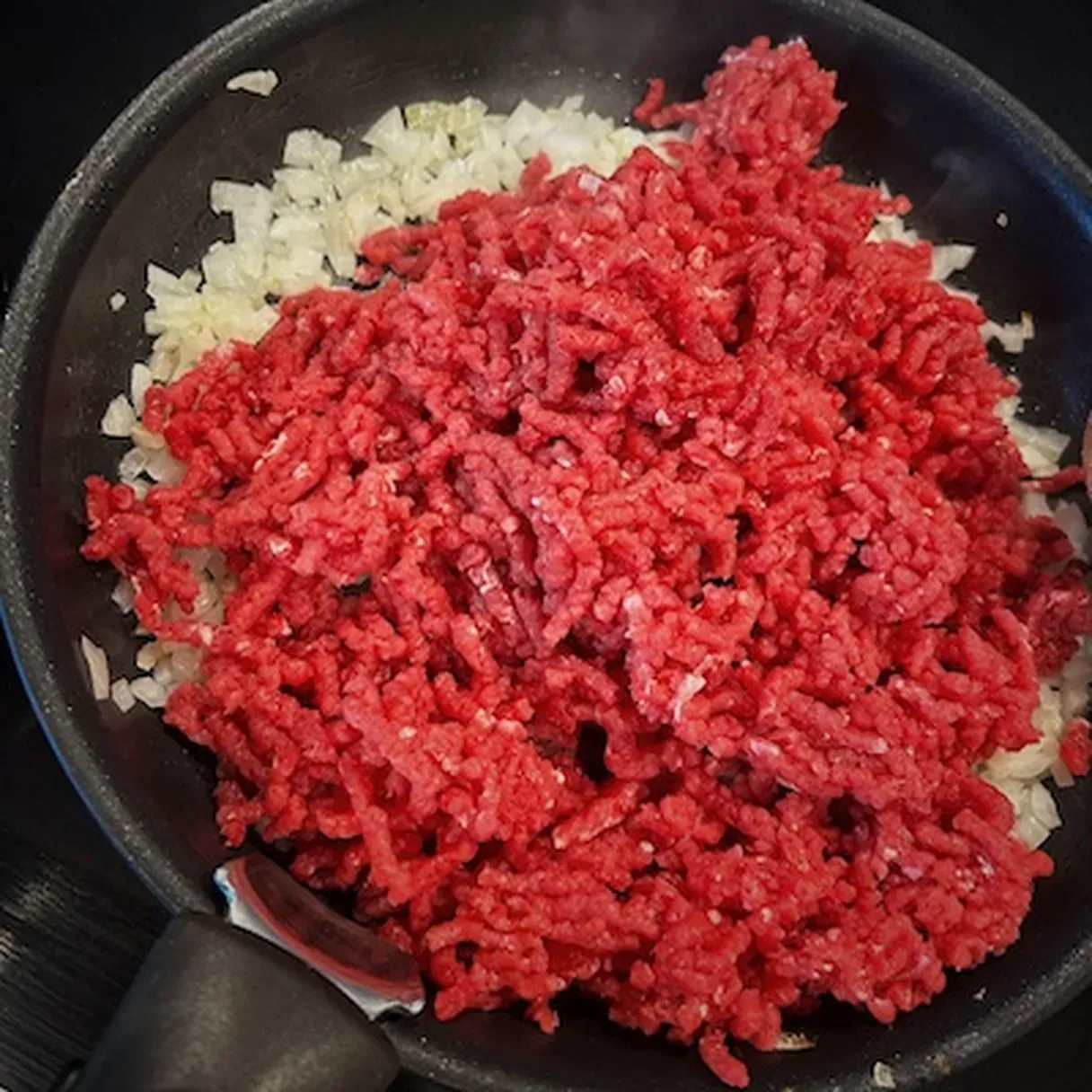 - In a pan, sauté a medium onion in grape seed oil. Add the seasoned meat.