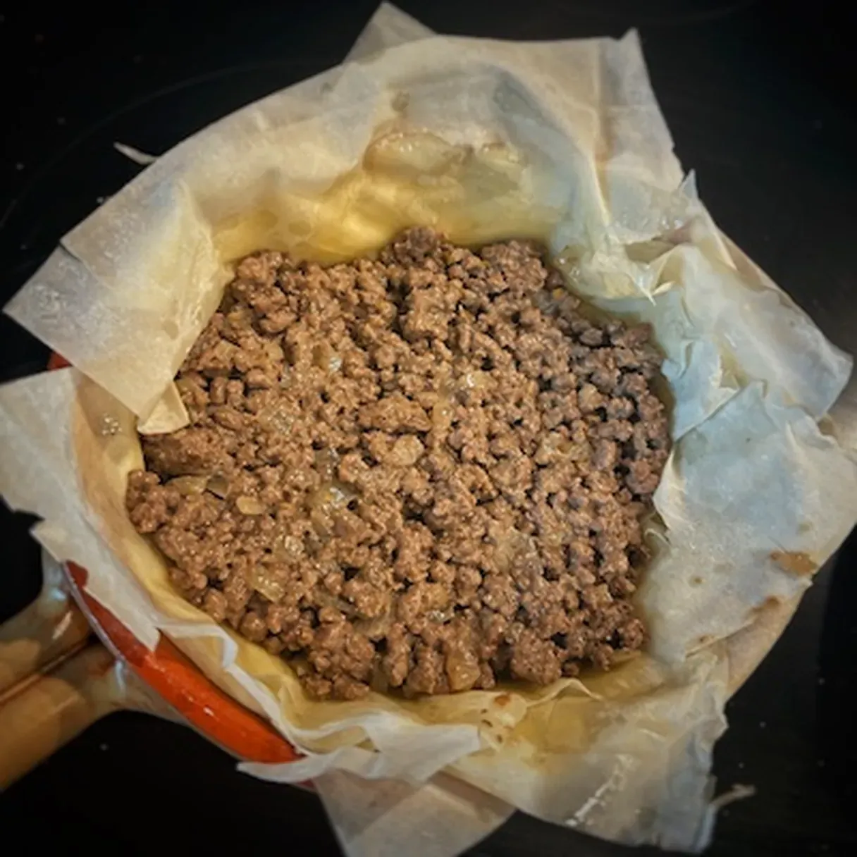 - Add a layer of meat, then 5 more phyllo sheets (each brushed with butter), another layer of meat.
