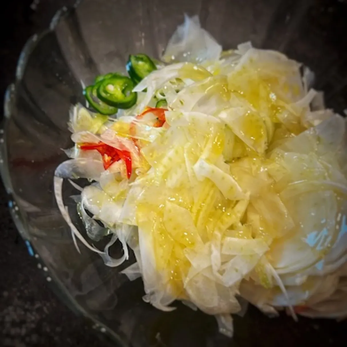 - Using a mandolin, slice a fennel bulb and add chili to taste, along with 2-3 thin strips of lemon. Toss with salt and 2 tablespoons of olive oil.