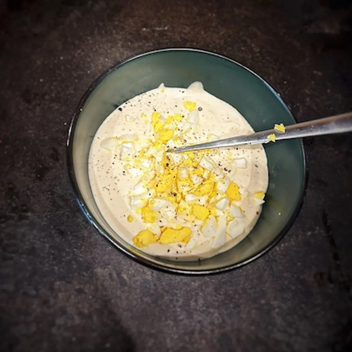 - Dice the second egg into small cubes and mix it with the egg-cashew paste, adding salt and pepper to taste. This creates a creamy yet textured base.