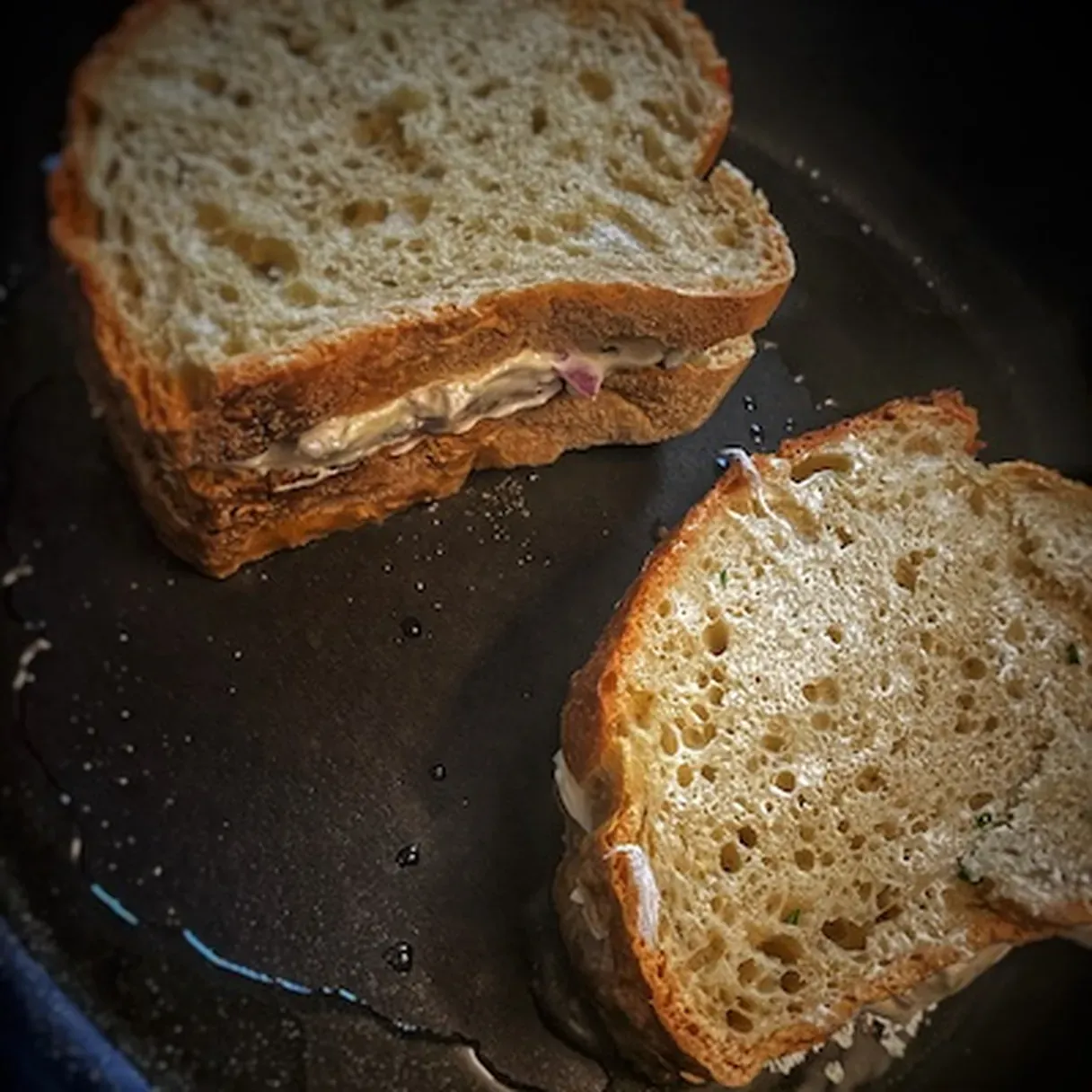- In a second pan, heat the other 2 tbsp of ghee. When the ghee is melted, place the sandwiches in the pan. Let them fry for 2-3 minutes on each side or until crispy and golden.