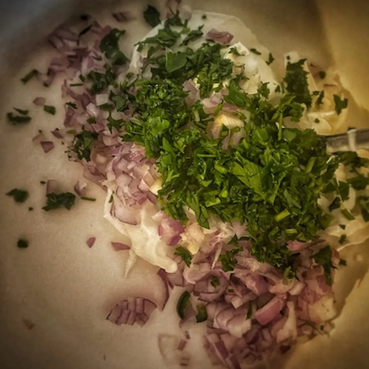 - Finely chop the onion, fresh green chili, parsley, and cilantro (sorry, Priya, but I love the taste of parsley in this dish). Mix them with Greek yogurt, olive oil, and salt.