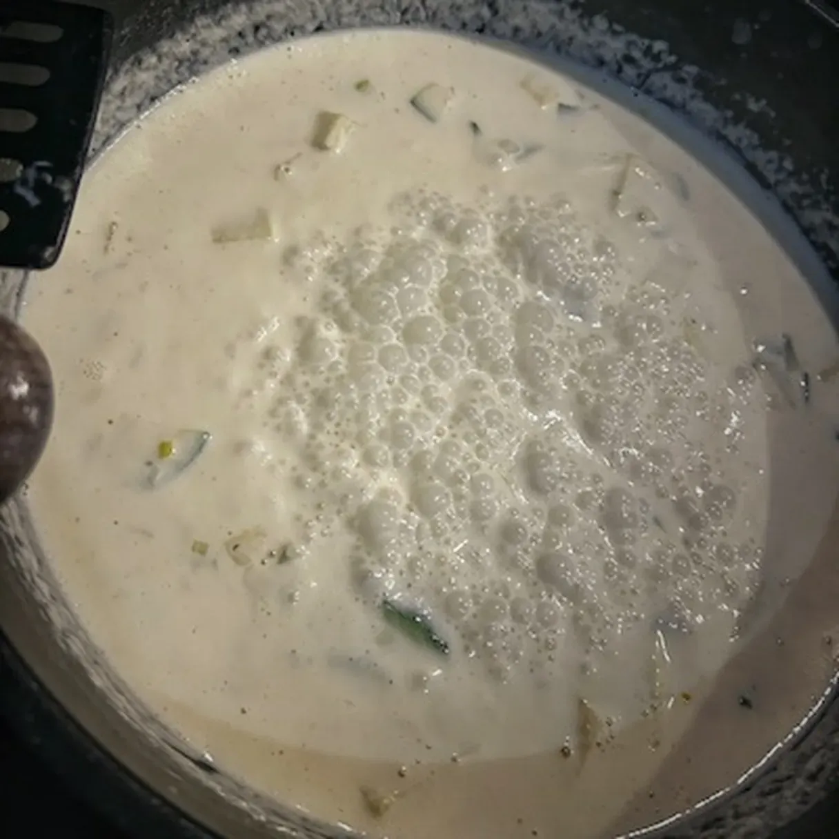 - Take a saucepan. Cook the chopped onion until translucent. Combine the vegetable stock with double cream, dijon mustard, salt, pepper, and a pinch of nutmeg. Add the chopped zucchini and cook on medium heat for 10-15 minutes or until the sauce reduces to half and is bubbly.